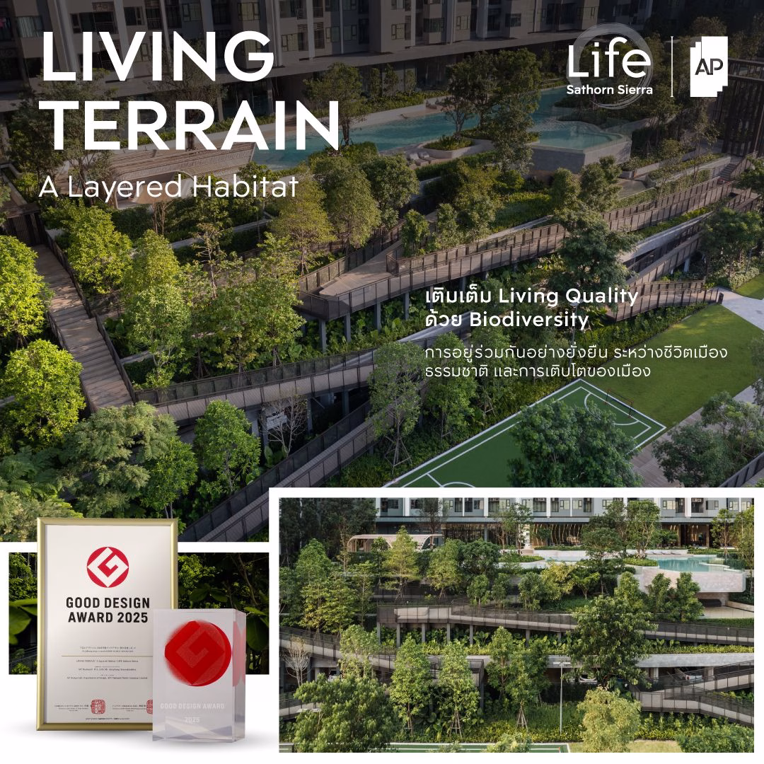 LIFE Sathorn Sierra – LIVING TERRAIN: A Layered Habitat ก็คว้ารางวัล Good Design Award ด้วยความโดดเด่นจากการออกแบบพื้นที่ส่วนกลางในโครงการคอนโดมิเนียม ที่คำนึงถึงบริบทของธรรมชาติและการสร้างสภาพแวดล้อมที่เชื่อมโยงถึงกัน (Layered Habitat) เพื่อมอบประสบการณ์การอยู่อาศัยและคุณภาพชีวิตที่อุดมสมบูรณ์และเป็นมิตรต่อทั้งผู้อยู่อาศัยในโครงการ นก ผีเสื้อ แมลงต่างๆ ต้นไม้และเมือง