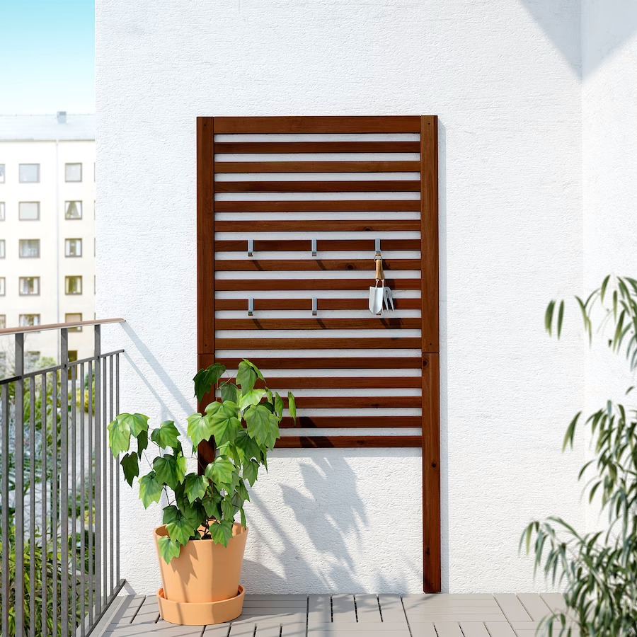 สำหรับใครที่มีพื้นที่น้อย แต่อยากจะมีพื้นที่สำหรับจัดวางอุปกรณ์ต่าง ๆ ให้เรียบร้อยบ้าง แผ่นระแนงกลางแจ้งถือได้ว่าตอบโจทย์อย่างมาก เพราะใช้พื้นที่เพียงข้างกำแพงและสามารถแขวนอุปกรณ์ต่าง ๆ ได้อย่างเป็นระเบียบ หรือจะนำต้นไม้มาแขวนด้วยก็สร้างความสวยงามด้วยเช่นกัน