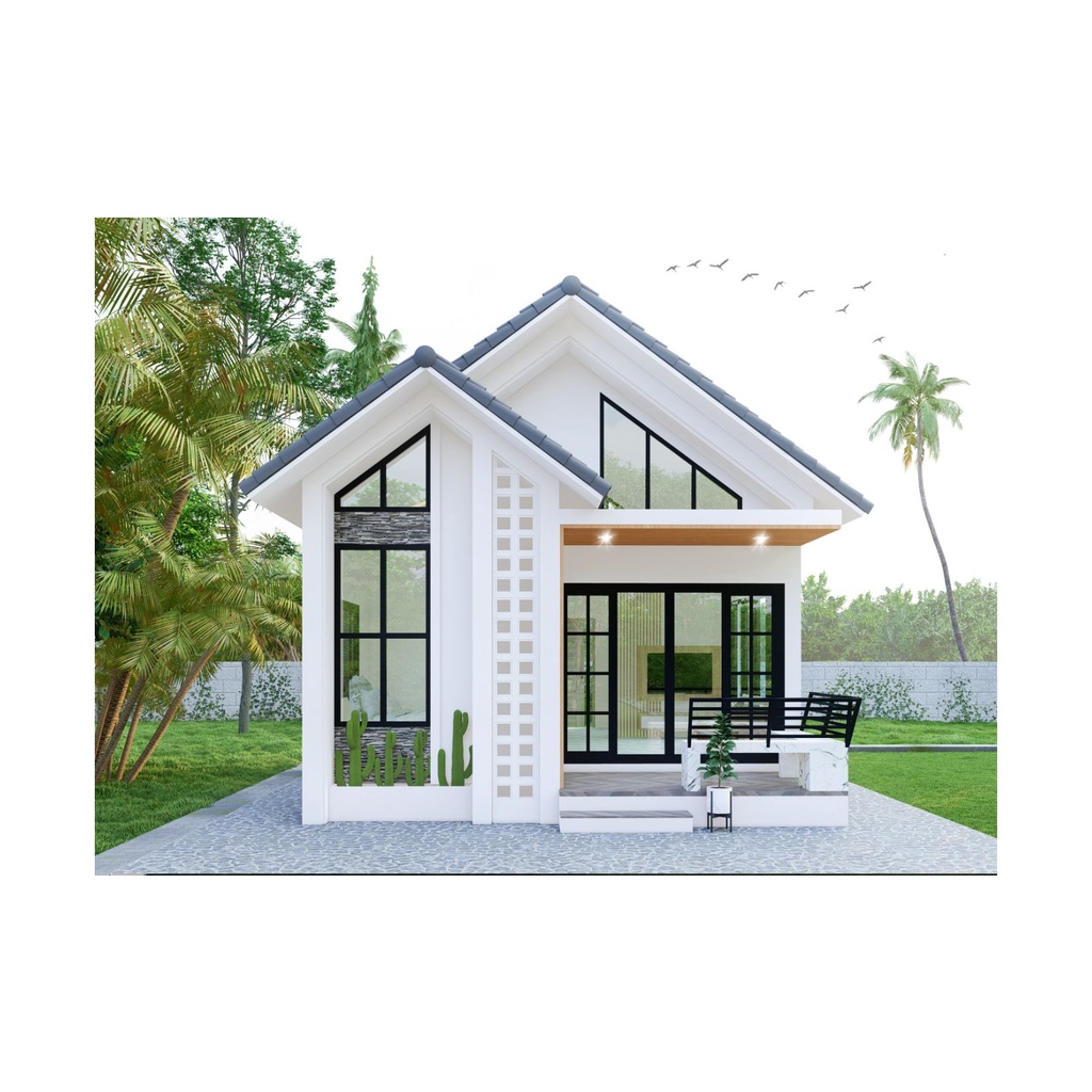 แบบบ้านมินิมอลโมเดิร์น ชั้นเดียว ทรงปั้นหยา งบราคา 5.5 แสน พื้นที่ใช้สอย 40 ตารางเมตร ฟังก์ชัน 2 ห้องนอน 1 ห้องน้ำ บ้านหลังเล็กแต่ดูดี โถงกว้างขวาง จุดเด่นคือมีชานหน้าบ้าน ผสมผสาน ระหว่างทรงจั่วและนอร์ดิกได้อย่างลงตัว