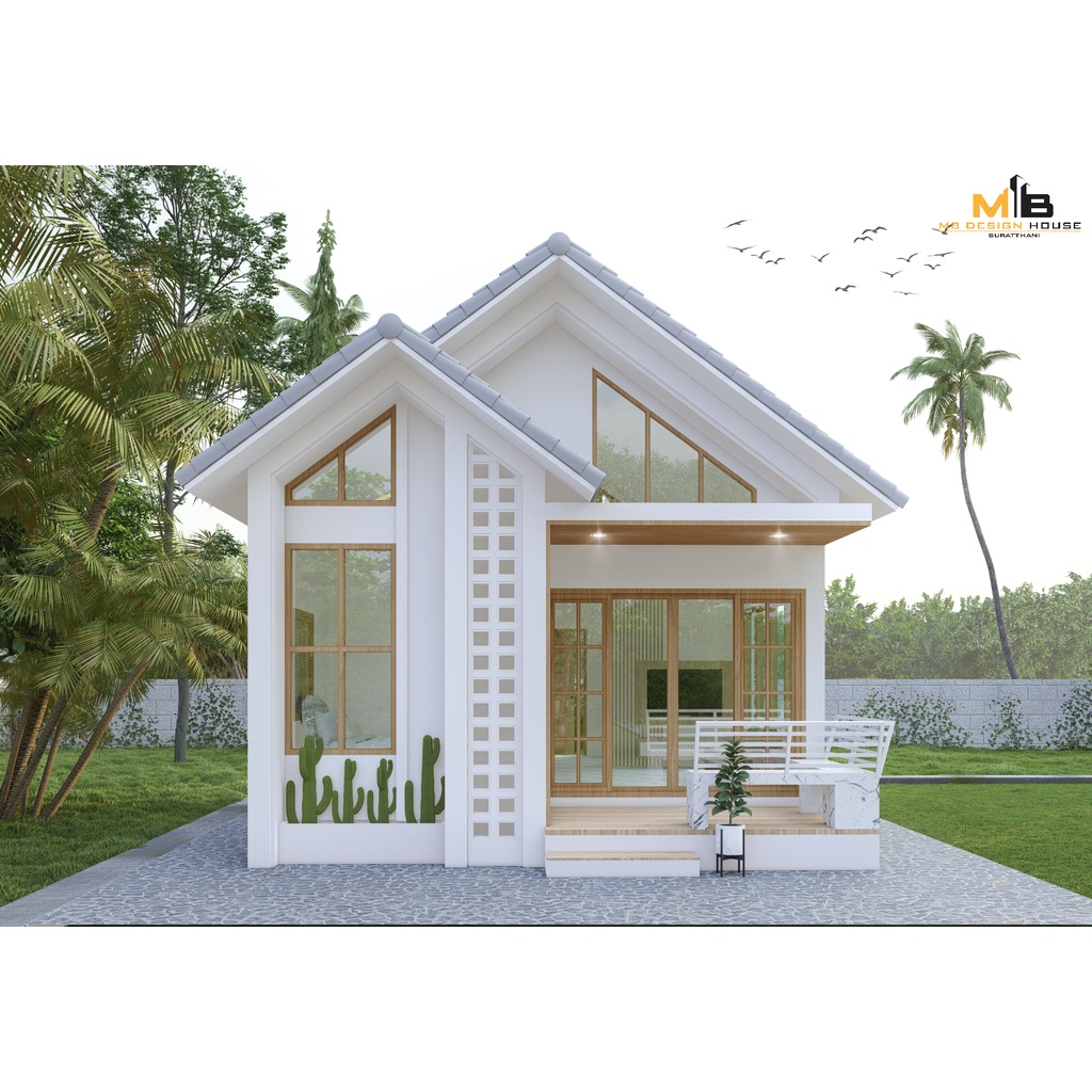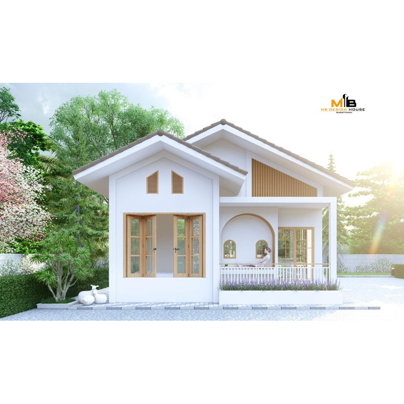 แบบบ้านมินิมอลโมเดิร์น ชั้นเดียว ทรงปั้นหยา งบราคา 5.8 แสน พื้นที่ใช้สอย 45 ตารางเมตร ฟังก์ชัน 2 ห้องนอน 1 ห้องน้ำ ตัวบ้านสีขาว ตัดด้วยไม้สีอ่อน ให้ความมินิมอลแบบญี่ปุ่น ดูอบอุ่น Cozy ด้านหน้ามีหน้าต่างบานใหญ่เปิดรับลม และมีชานพักบริเวณหน้าบ้านสำหรับพักผ่อน