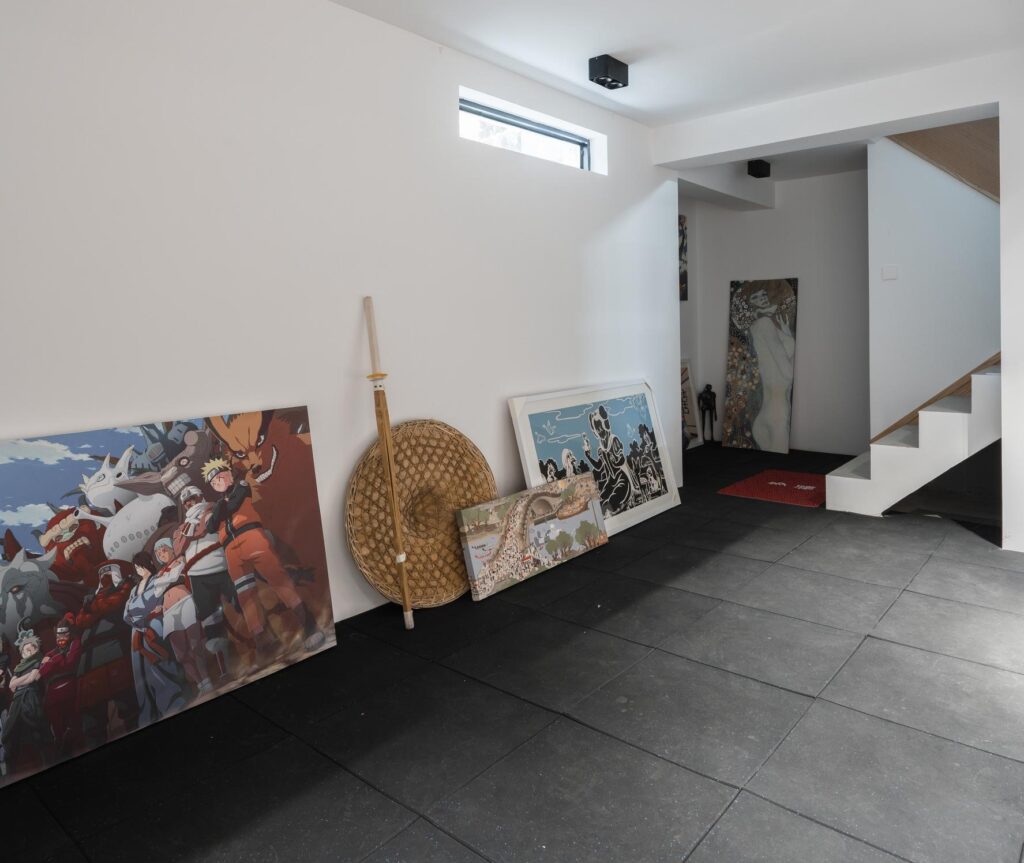 เนรมิตใต้ถุนบ้านเป็นพื้นที่จัดแสดงงานศิลปะส่วนตัว ติดตั้งไฟส่องสว่างพิเศษ จัดวางกรอบรูป งานศิลปะ และของสะสม สร้างพื้นที่แสดงออกทางความคิดสร้างสรรค์และความเป็นตัวตน