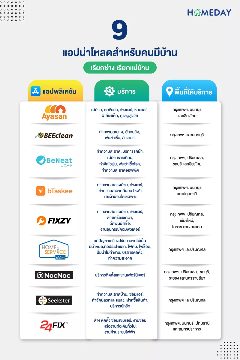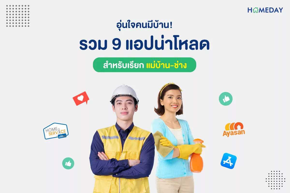 เดี๋ยวนี้บริการแอปเรียกแม่บ้าน-ช่าง สะดวกสบายกว่าสมัยก่อนมาก จ่ายจบในแอป ไม่ต้องกลัวว่าหน้างานที่เรียกเก็บจะไม่เหมือนที่คุยกันไว้ วันนี้ Homeday เลยมาแนะนำ 9 แอปดี ๆ ที่คนมีบ้านน่าจะโหลดไว้ติดเครื่องกันสักหน่อย แอปเรียกแม่บ้าน-ช่าง มีทั้งที่ในบริการเฉพาะในกรุงเทพฯ-ปริมณฑล และที่รองรับพื้นที่ต่างจังหวัด บริการของแต่ละแอปก็มีความแตกต่างกันไป ทั้งงานบริการ งานซ่อมแซม และงานติดตั้ง ลองเลือกดูกันได้เลย ได้มาตรฐานทุกแอปแน่นอนครับ