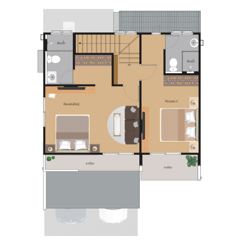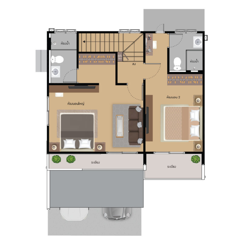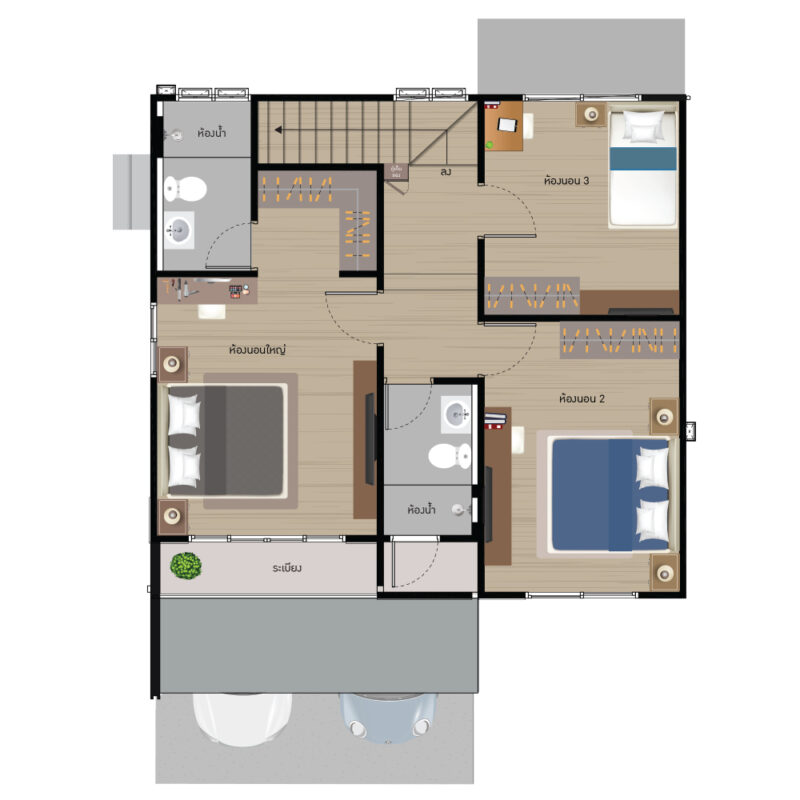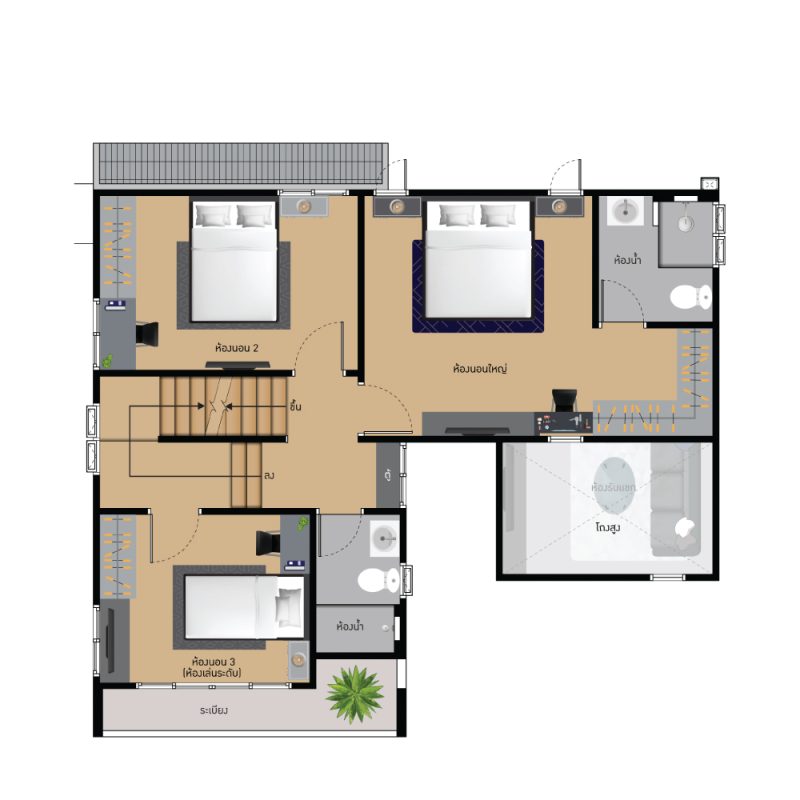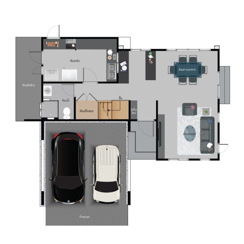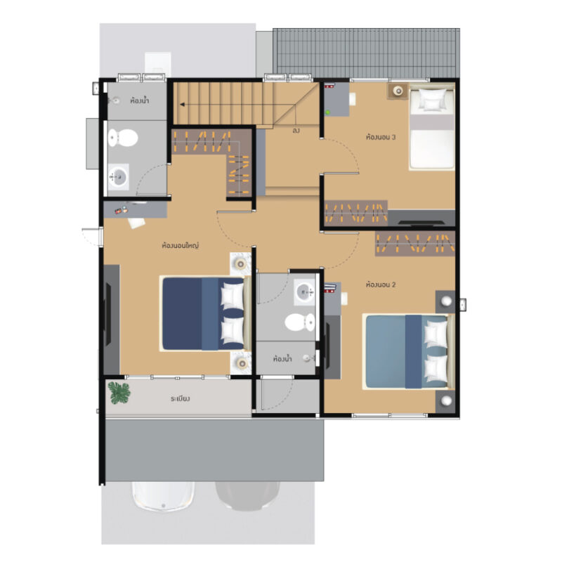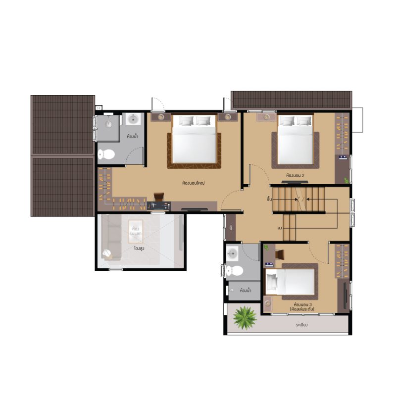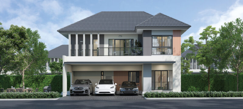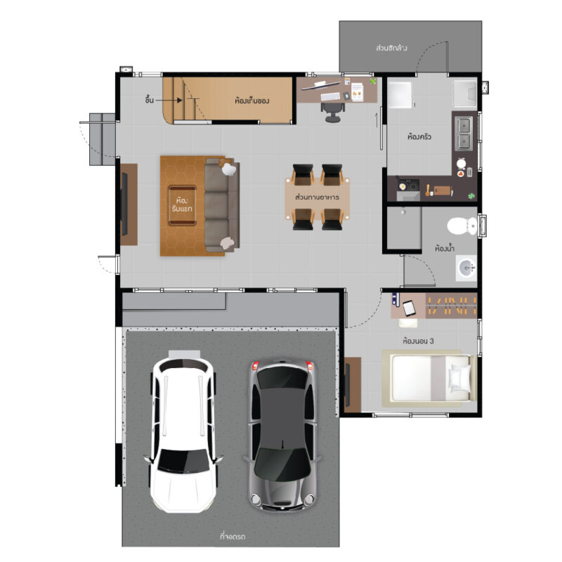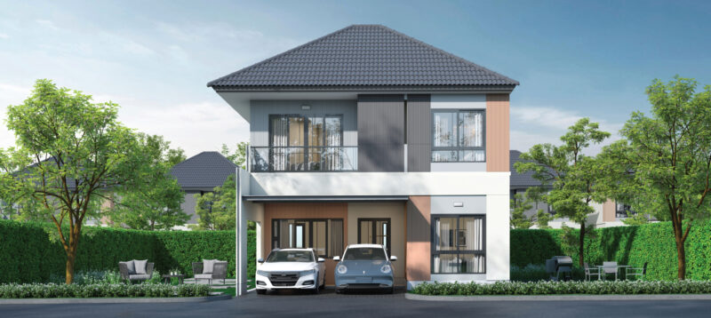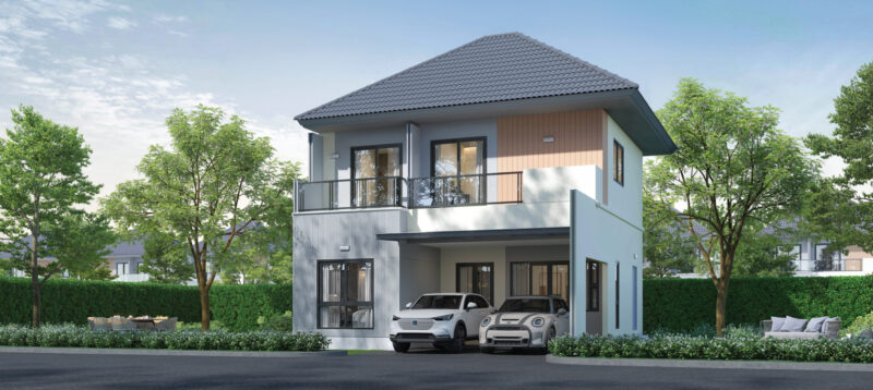 พื้นที่ใช้สอย 155 ตร.ม. ฟังก์ชันบ้าน 3 ห้องนอน, 3 ห้องน้ำ, 1 ห้องครัว พร้อมที่จอดรถ 2 คัน