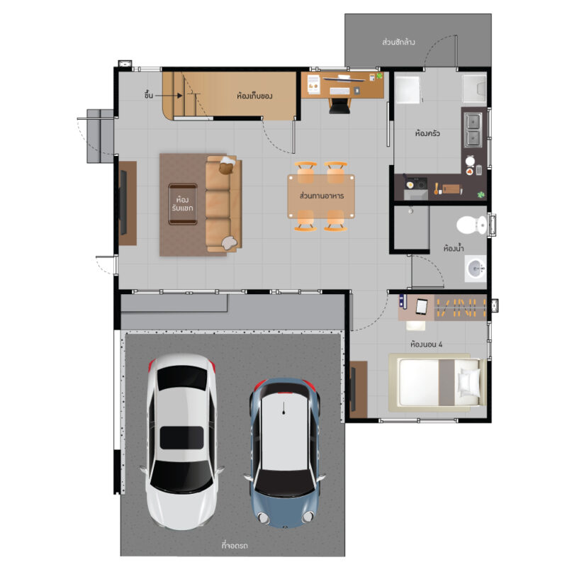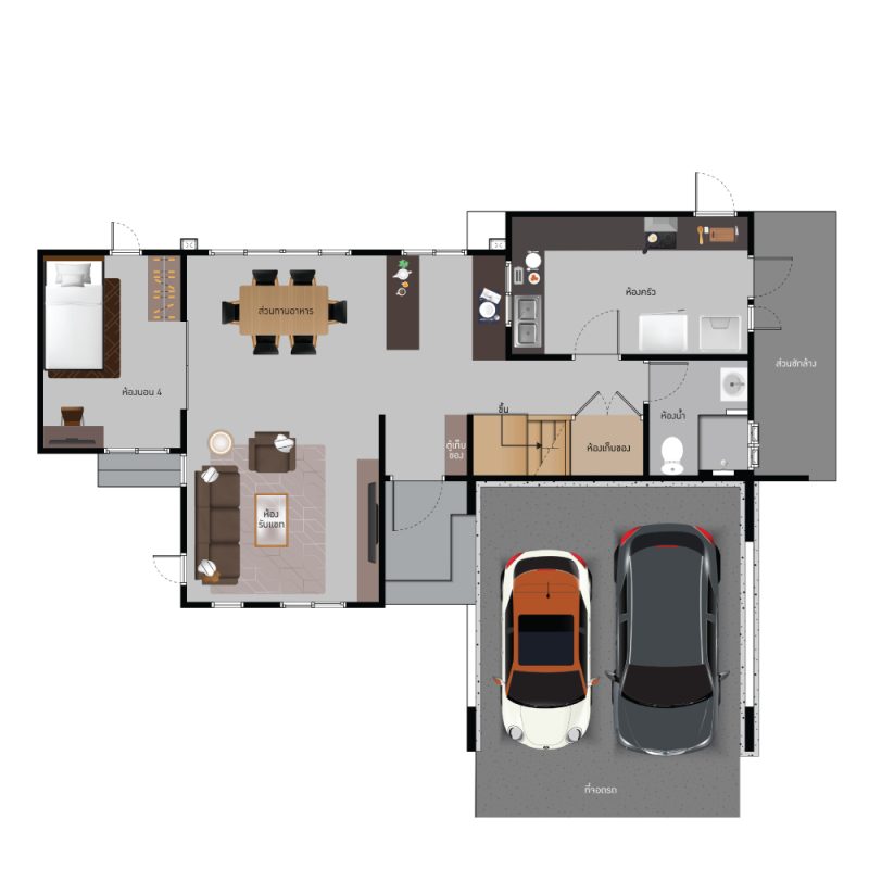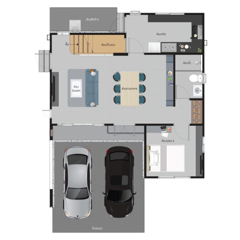 พื้นที่ใช้สอย 158 ตร.ม. ฟังก์ชันบ้าน 4 ห้องนอน, 3 ห้องน้ำ, 1 ห้องครัว พร้อมที่จอดรถ 2 คัน