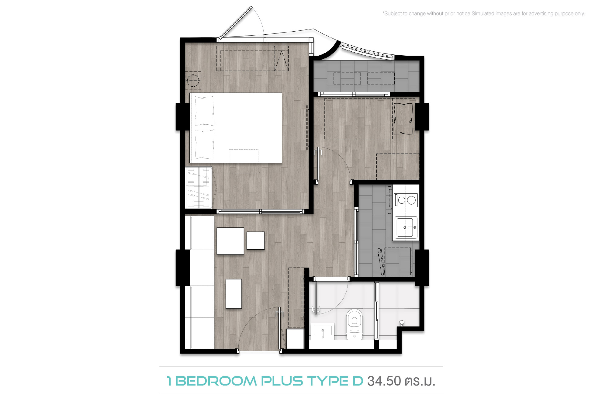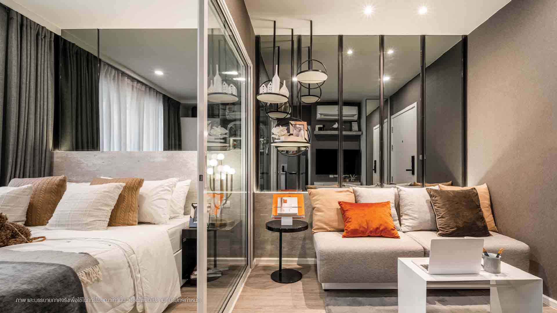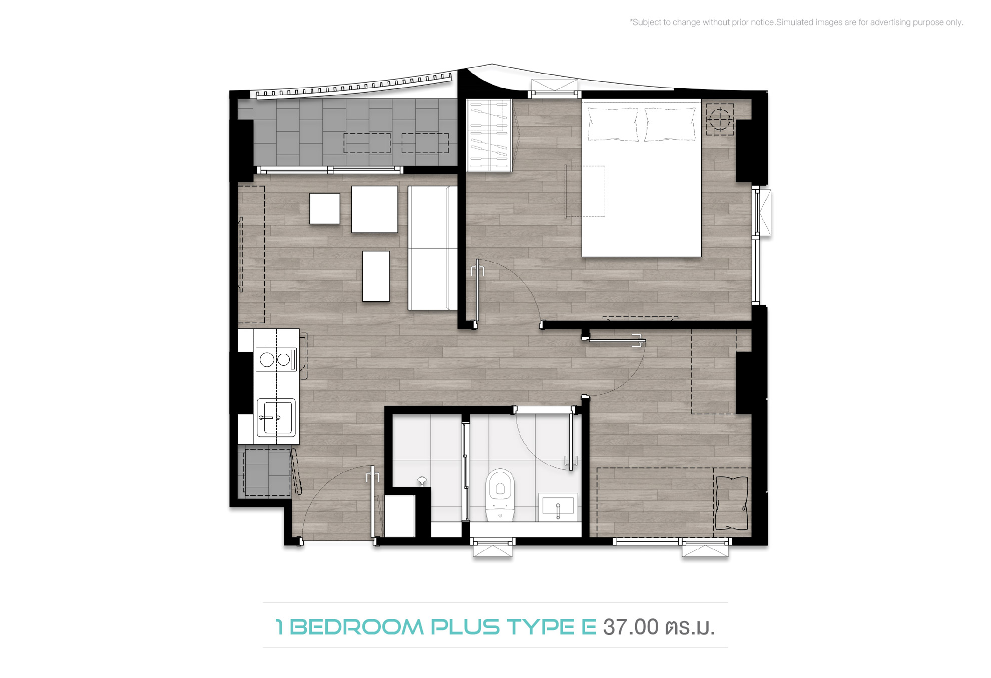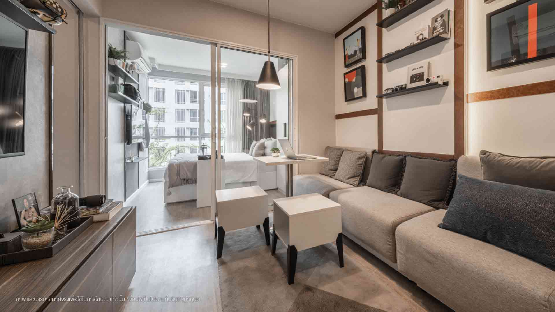 เมื่อเปิดประตูบ้านเข้ามา จะพบ Living Area ที่มีขนาดกว้างพอสมควร สามารถวางชุดโซฟา และชั้นวางทีวีได้ค่ะ ยังมีพื้นที่เหลือสำหรับเดินสวนกันได้สบาย สำหรับห้อง Master Bedroom จะมีห้องน้ำในตัวค่ะ ภายในห้องน้ำออกแบบมาให้ใช้สอยได้อย่างสะดวกเช่นเคยค่ะ แบ่งโซนเปียก-แห้ง ไว้ชัดเจน มีที่กั้น Partition กระ