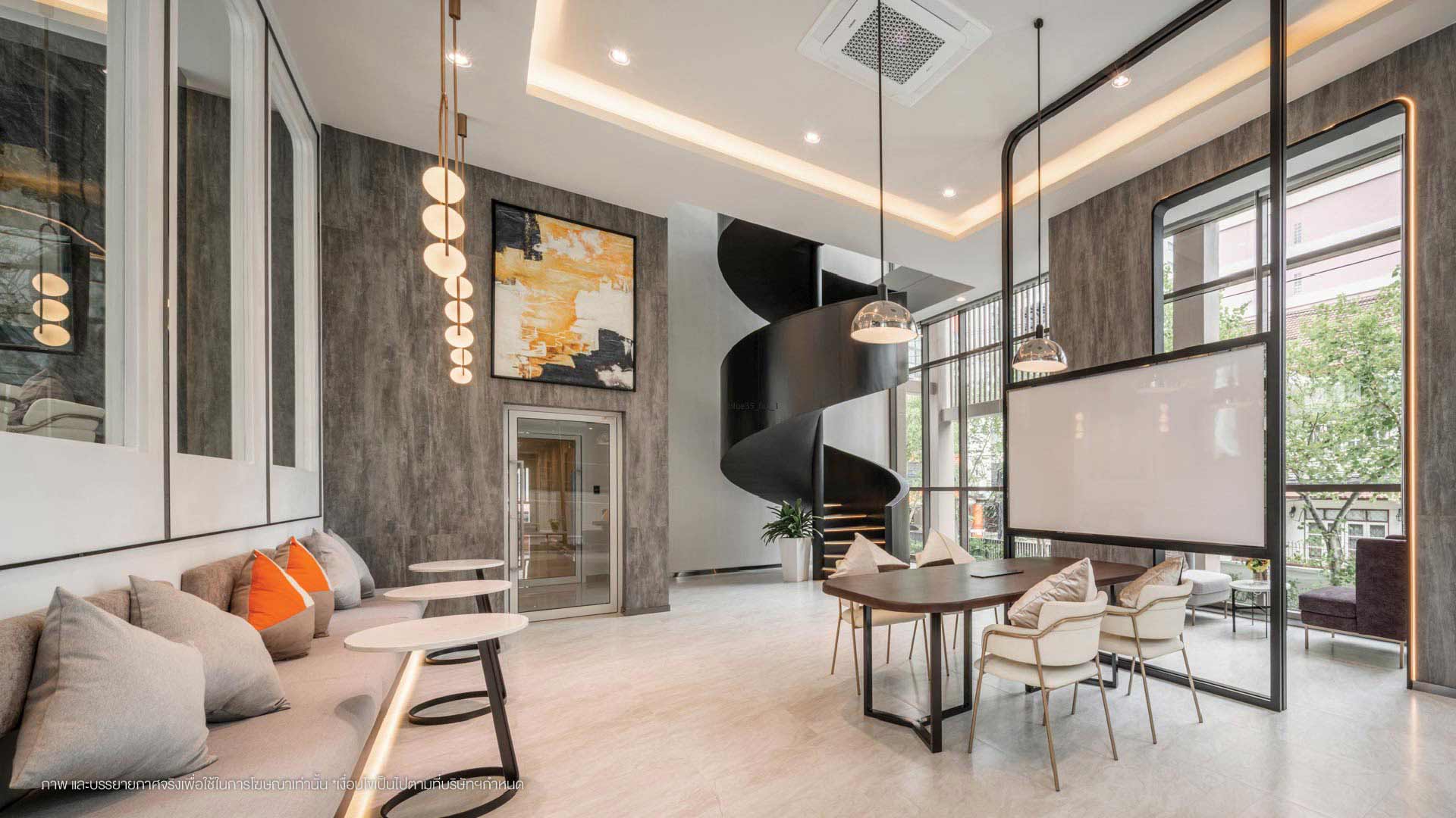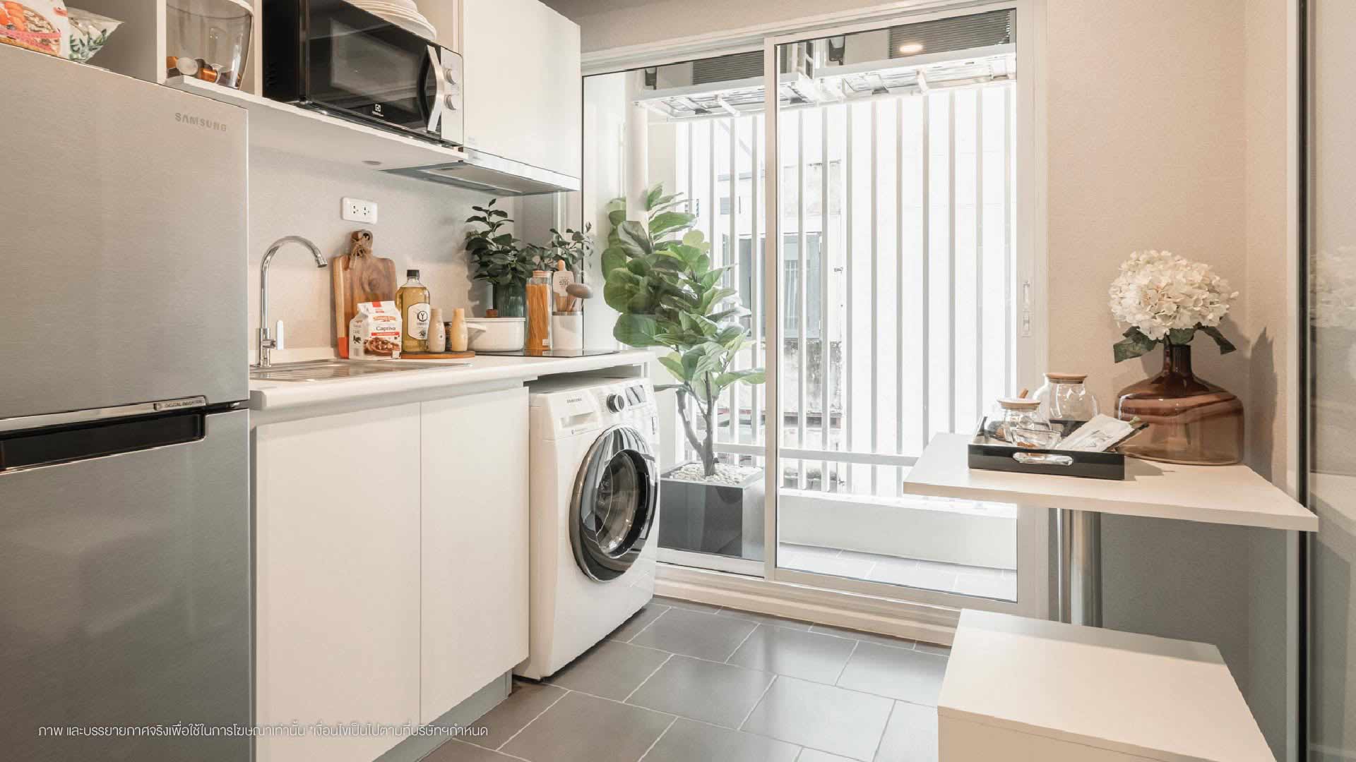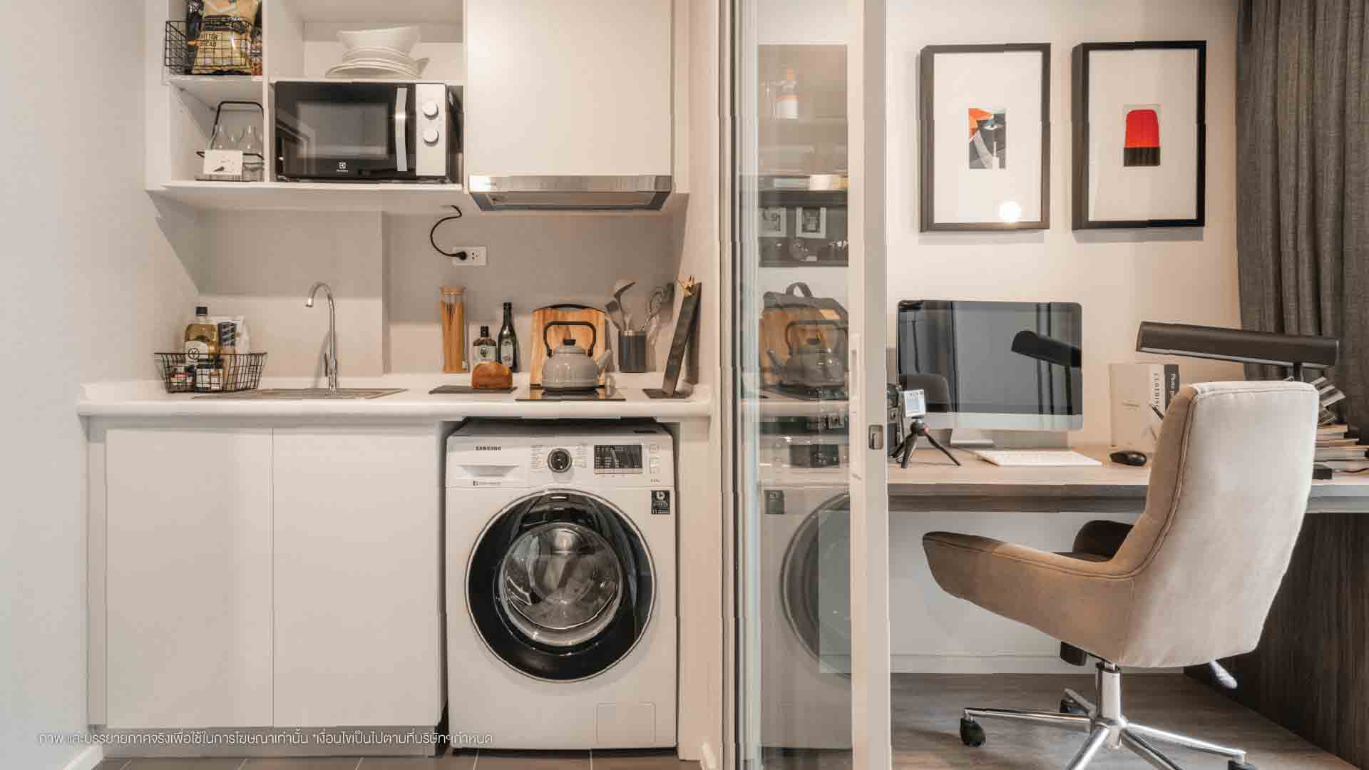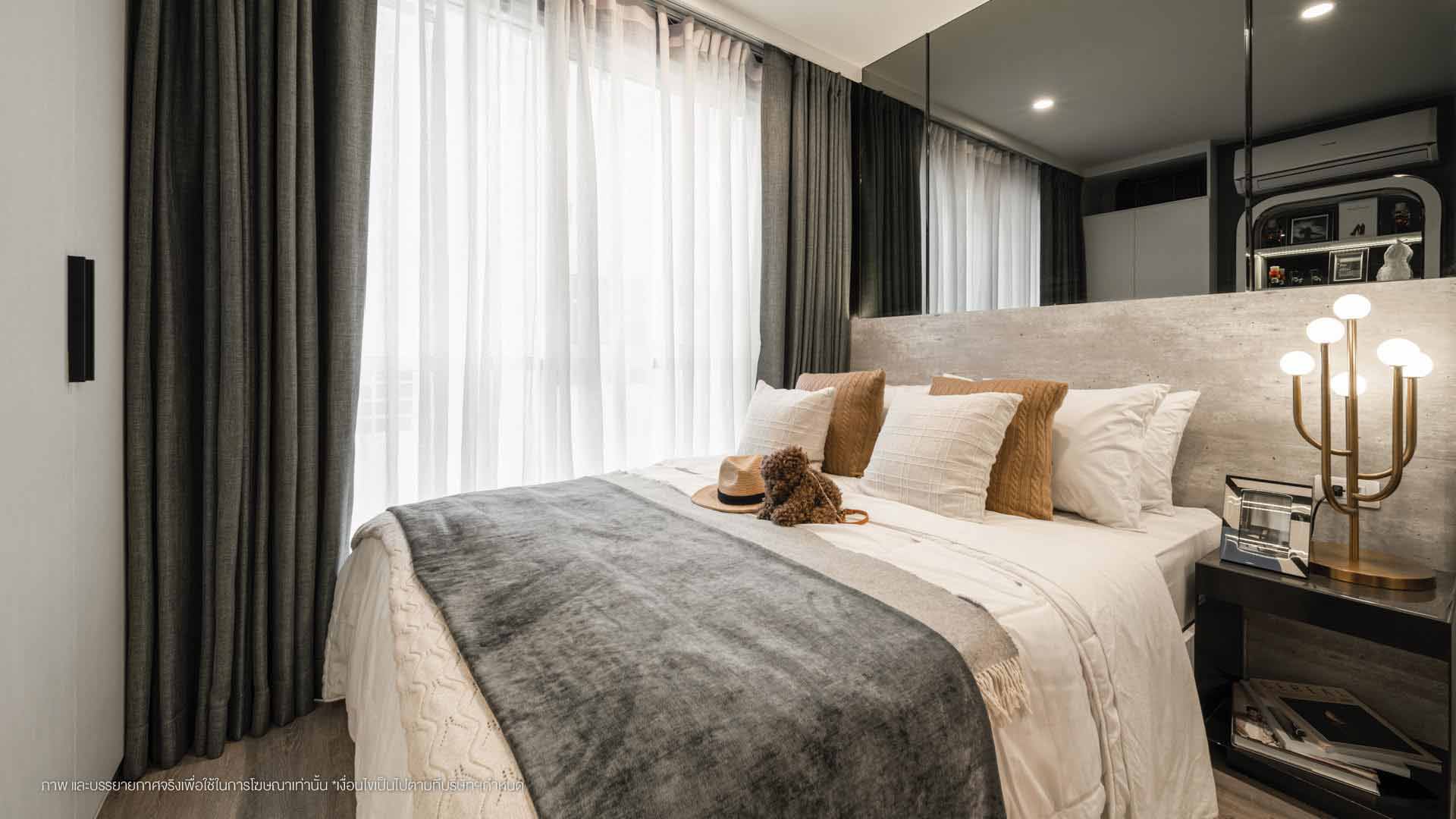 เมื่อเปิดประตูบ้านเข้ามา จะพบ Living Area ที่มีขนาดกว้างพอสมควร สามารถวางชุดโซฟา และชั้นวางทีวีได้ค่ะ ยังมีพื้นที่เหลือสำหรับเดินสวนกันได้สบาย สำหรับห้อง Master Bedroom จะมีห้องน้ำในตัวค่ะ ภายในห้องน้ำออกแบบมาให้ใช้สอยได้อย่างสะดวกเช่นเคยค่ะ แบ่งโซนเปียก-แห้ง ไว้ชัดเจน มีที่กั้น Partition กระ