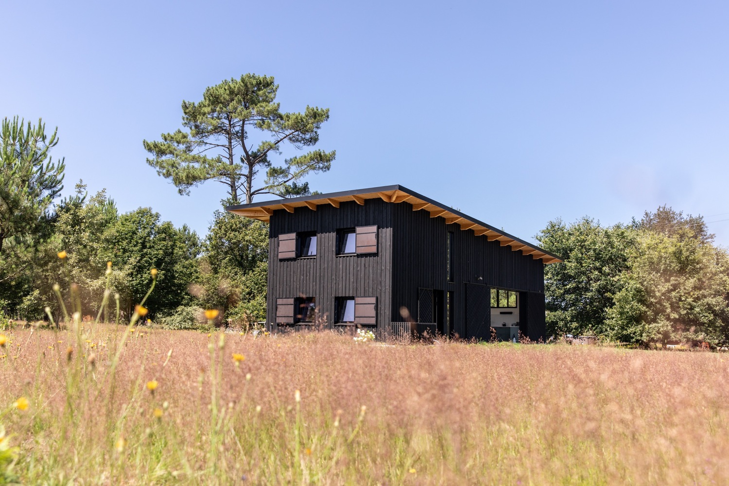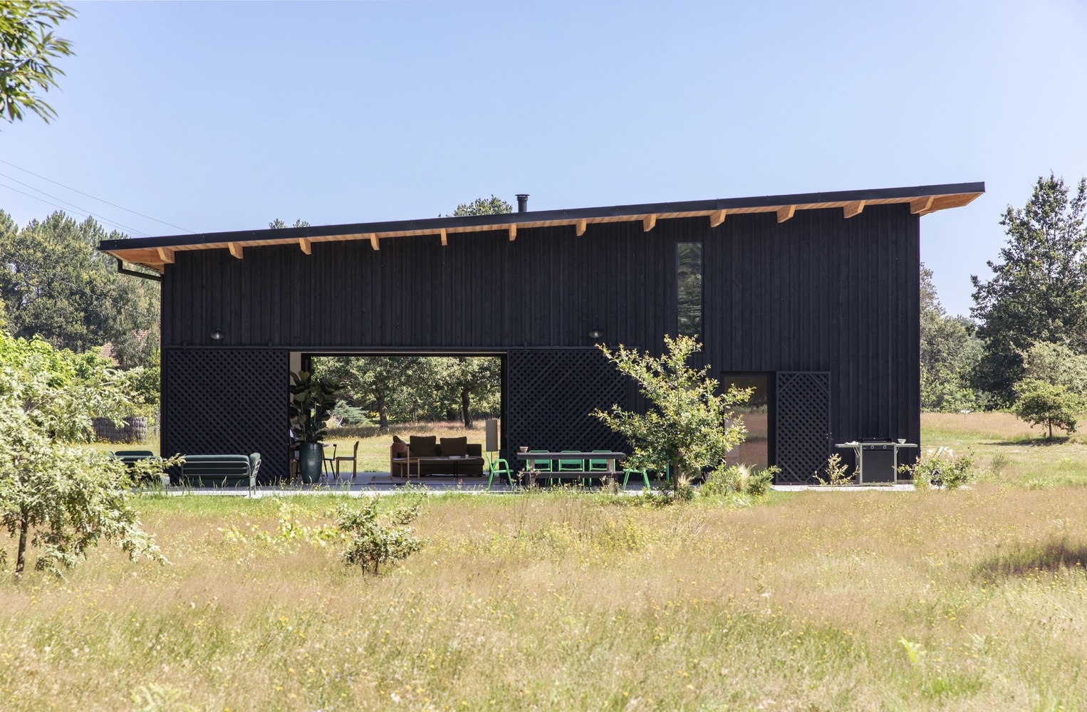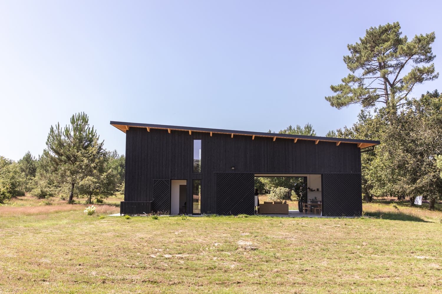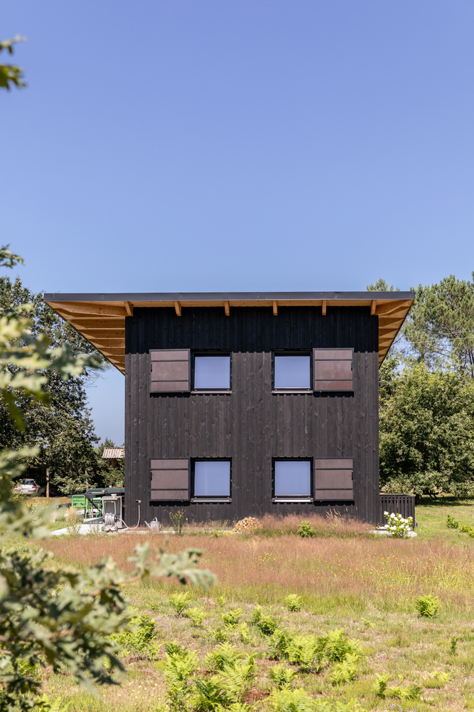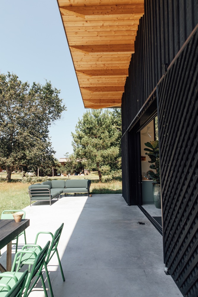 ไอเดียแต่งบ้านหลังนี้ ออกแบบโดยสถาปนิก LESGOURGUES ตั้งอยู่ทางตะวันตกเฉียงใต้ของประเทศฝรั่งเศส ซึ่งเป็นพื้นที่โปร่งโล่งขนาดใหญ่กลางทุ่งนา นักออกแบบเลือกใช้ไม้สีดำ และชายคาจากธรรมชาติในการสร้างบ้านหลังนี้ ให้ออกมาตอบโจทย์มากที่สุด โดยมีแรงบันดาลใจมาจากโรงนา และอาคารในทางการเกษตรต่างๆ เพื่อให้สามารถสังสรรค์กับเพื่อนๆ และครอบครัวในวันหยุดสุดสัปดาห์ จึงให้ความสำคัญในการจัดห้องนั่งเล่นเป็นอย่างมาก
