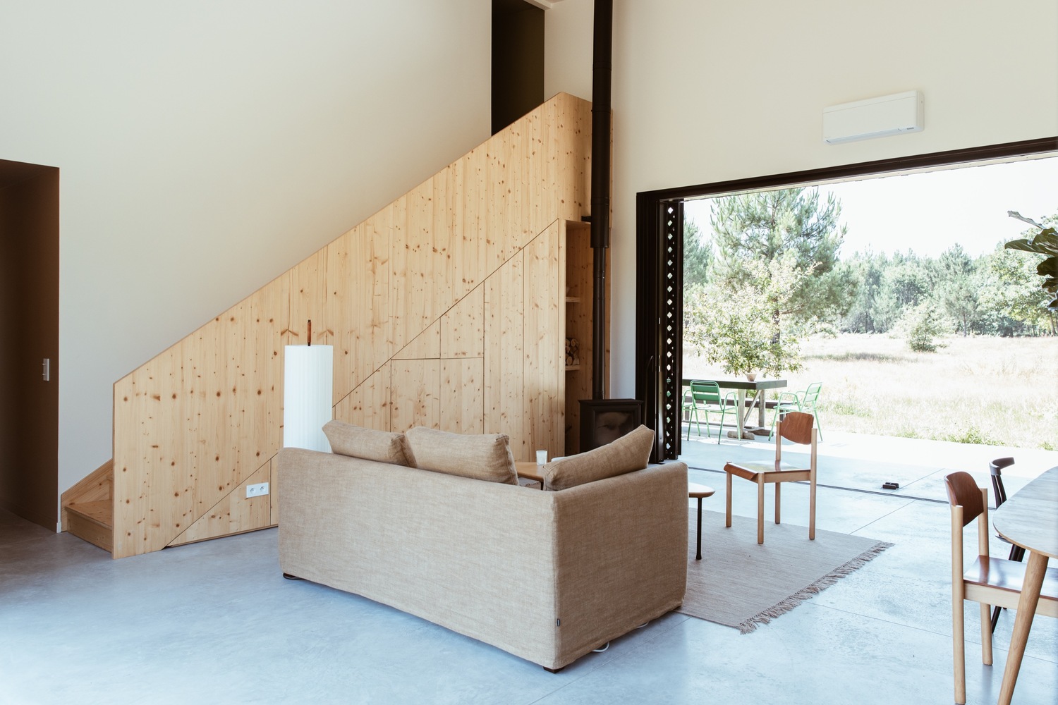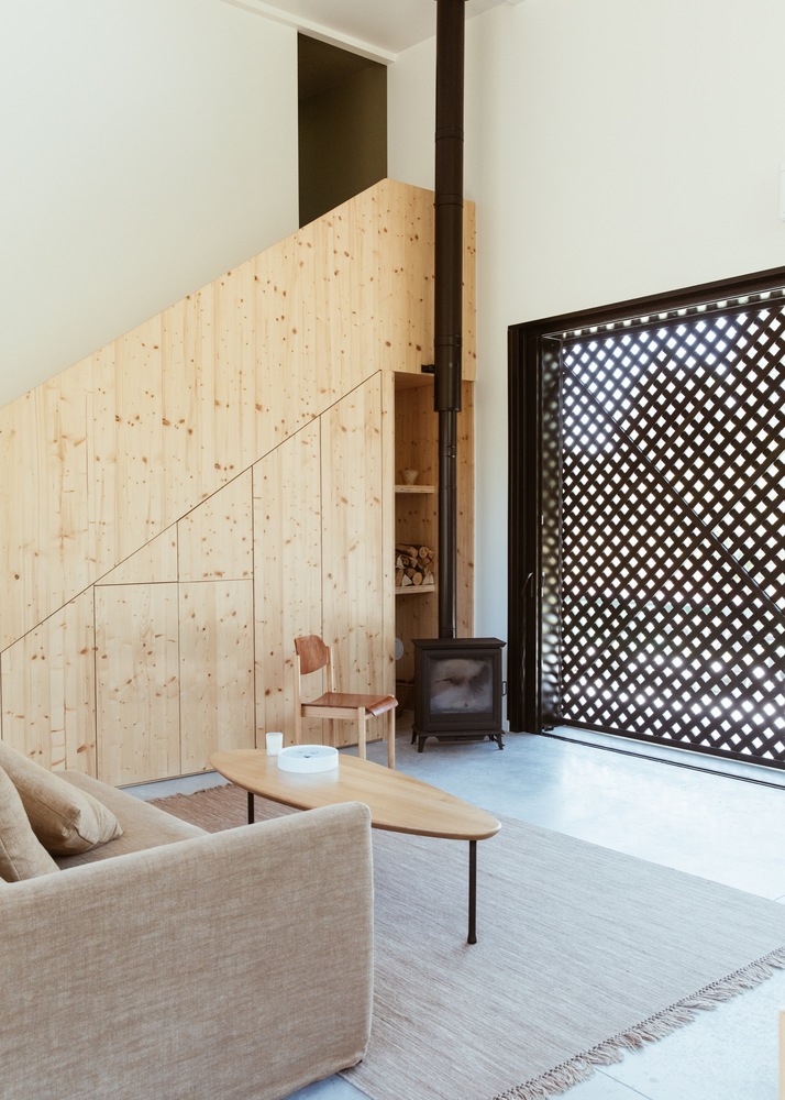 ภายในบ้านเลือกใช้กำแพงเป็นสีขาว เน้นการตกแต่งด้วยไม้จากธรรมชาติ ตัดด้วยเฟอร์นิเจอร์สีดำอย่างประตูบ้าน สีของขอบหน้าต่างบานใหญ่ หรือเตาผิง ให้บรรยากาศที่เรียบง่ายแบบลงตัว ถัดไปที่ชั้นสองจะเป็นห้องนอน พร้อมหน้าต่างสองบาน ในทุกๆ วันก็จะสามารถตื่นมารับลมชมวิว สูดอากาศบริสุทธิ์ในยามเช้าได้อย่างเต็มที่ นอกจากนี้บริเวณรอบๆ ตัวบ้านจะเป็นสนามหญ้ากว้างขวาง ที่ไม่ว่าจะมองไปทางไหนก็สบายตา สบายใจ และสดชื่นสุดๆ