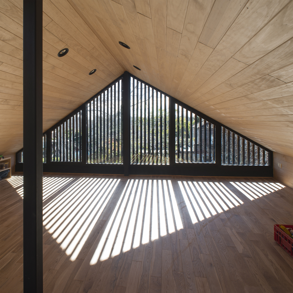 ประตูรั้วอยู่ส่วนกลางเป็นไม้ระแนงวางเรียงกันแบบฟาซาดในกรอบเหล็กสีดำ ทำให้บ้านมีความทันสมัย และมีลูกเล่นเป็นเอกลักษณ์ ทั้งนี้บริเวณรอบๆ บ้านได้จัดสวนไม้ใบเขียวเล็กๆ และสร้างสระน้ำหลังบ้าน เมื่อมองรวมกับงานไม้ก็จะช่วยลดทอนความแข็งกระด้างของคอนกรีตดิบๆ กับงานเหล็กได้เป็นอย่างดี แม้ว่าวัสดุที่มาอยู่รวมกันจะมีคุณสมบัติแตกต่างกัน แต่กลับเติมความสมดุลของพื้นผิวได้อย่างลงตัว นอกจากนี้ยังติดตั้งกระจกใสบานใหญ่ เพื่อเชื่อมโยงพื้นที่ทั้งภายใน และภายนอกให้เป็นเสมือนหนึ่งเดียวกันท่ามกลางธรรมชาติที่สวยงาม