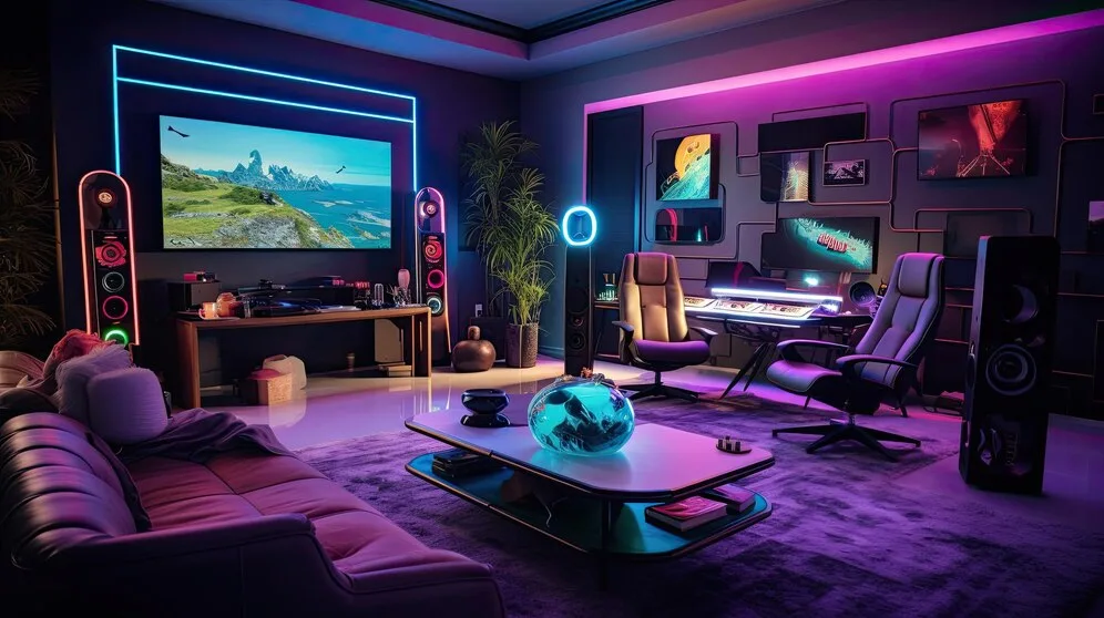 4. สไตล์ Cyberpunk – ได้แรงบันดาลใจจากเกมและภาพยนตร์แนวไซเบอร์พังค์ เน้นความทันสมัยผสมกับความเสื่อมโทรม ใช้ไฟสีสะท้อนตัดกับพื้นหลังมืด ตกแต่งด้วยวอลเปเปอร์หรือโปสเตอร์ที่มีลักษณะเป็นกราฟฟิตี้หรือรูปทรงเรขาคณิต เน้นฟังก์ชันการใช้งานที่หลากหลาย