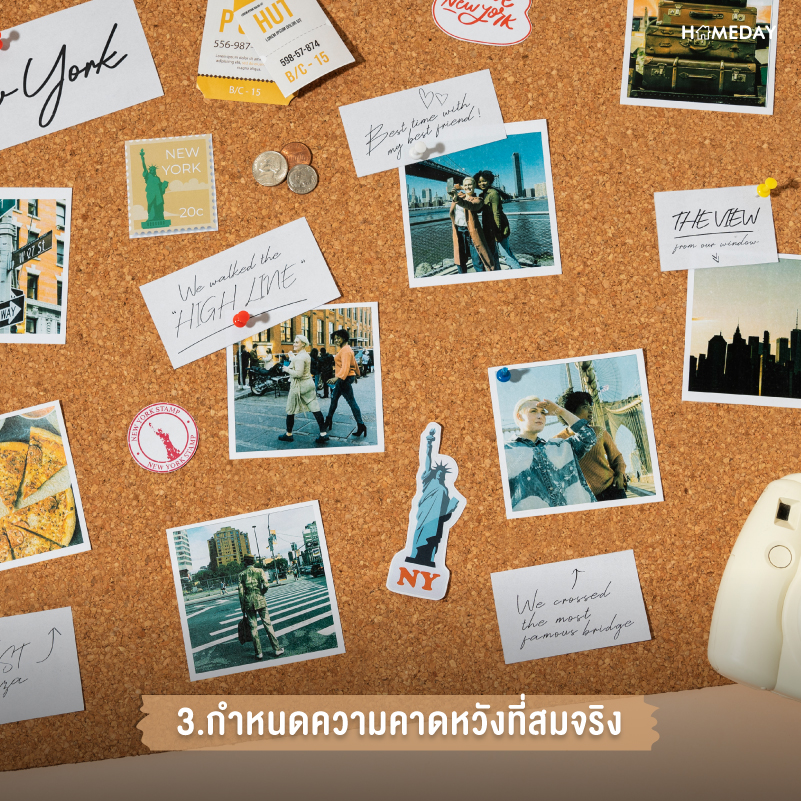 ลองตั้งความคาดหวังที่สมเหตุสมผลในปีหน้า หรือเป้าหมายที่จะสามารถบรรลุได้ 5-10 ปี การตั้งความคาดหวังเล็ก ๆ น้อย ๆ ที่สามารถทำได้จริง ไม่เพ้อฝันไกลตัวมากจนเกินไป ดีต่อเรามากกว่า เพราะเราสามารถมองเห็นภาพของตัวเองในเป้าหมายนั้น ๆ ได้ชัดเจนกว่า ทำให้เรารู้สึกถึงความสำเร็จได้มากกว่านั่นเอง