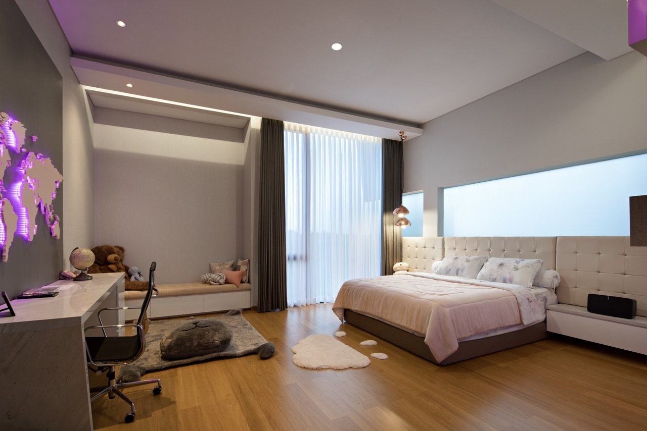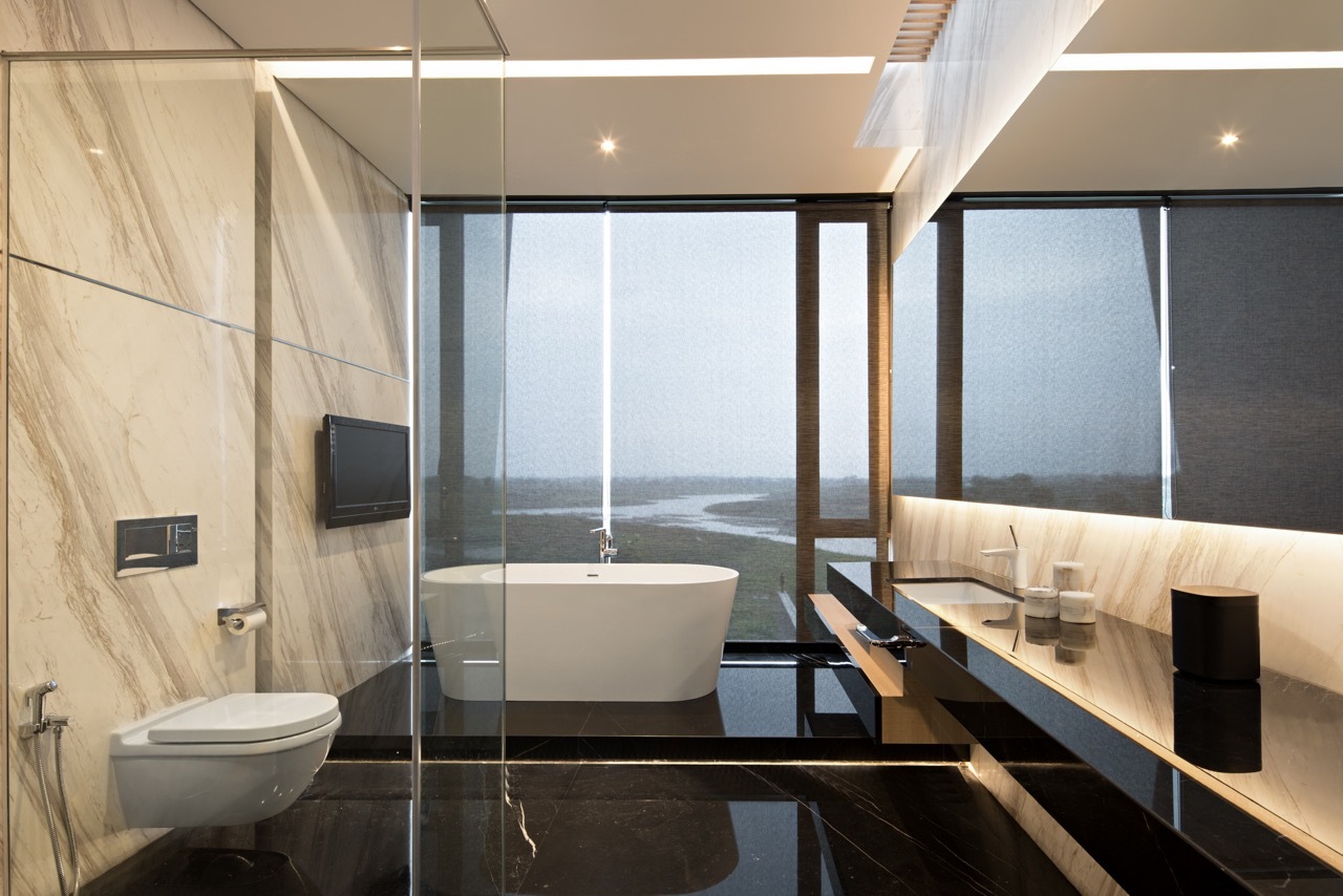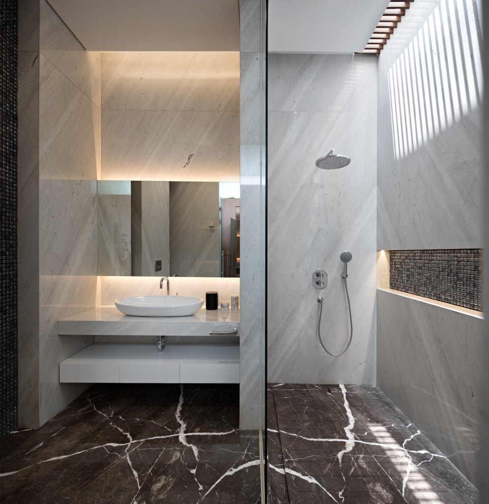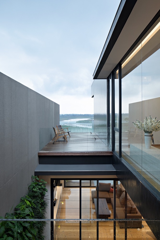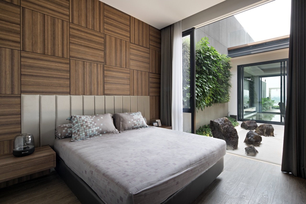 ภายนอกเลือกใช้สีคุมโทนแบบ Monochrome เน้นความเป็นโมเดิร์นด้วยหลังคาที่แบนราบ และหน้าต่างใสบานใหญ่รอบๆ บ้าน ที่สำคัญนักออกแบบยังจัดลำดับความเป็นส่วนตัวสำหรับผู้อาศัย โดยเริ่มจากวางตำแหน่งห้องโถงเป็นทางเข้าที่วางขนานไปกับสระว่ายน้ำที่สะท้อนแสงระยิบระยับตลอดเวลา และระหว่างพื้นที่ส่วนตัว และพื้นที่ส่วนกลางมีคอร์ทยาร์ดพร้อมสวนแนวตั้งเป็นจุดแกนนำสายตาให้ความรู้สึกผ่อนคลาย แถมตอบโจทย์แนวคิดที่ต้องการบ้านที่มีความเป็นธรรมชาติผสมผสานกับกลิ่นอายของความทันสมัยได้ดี