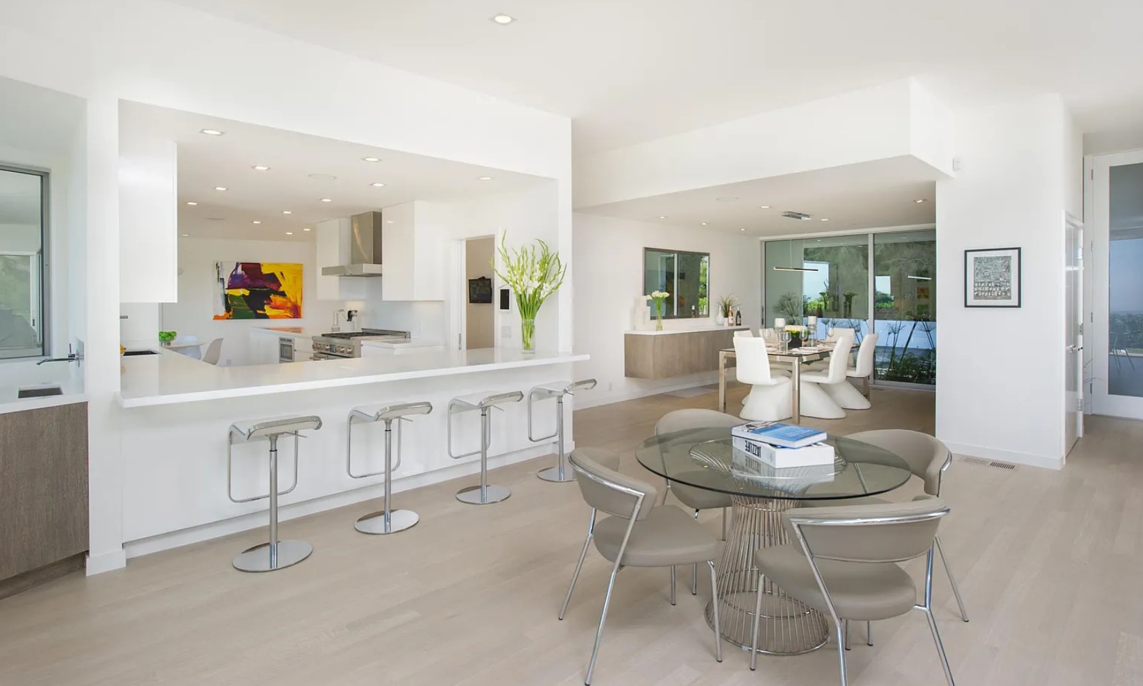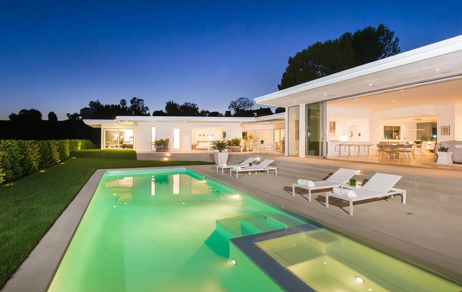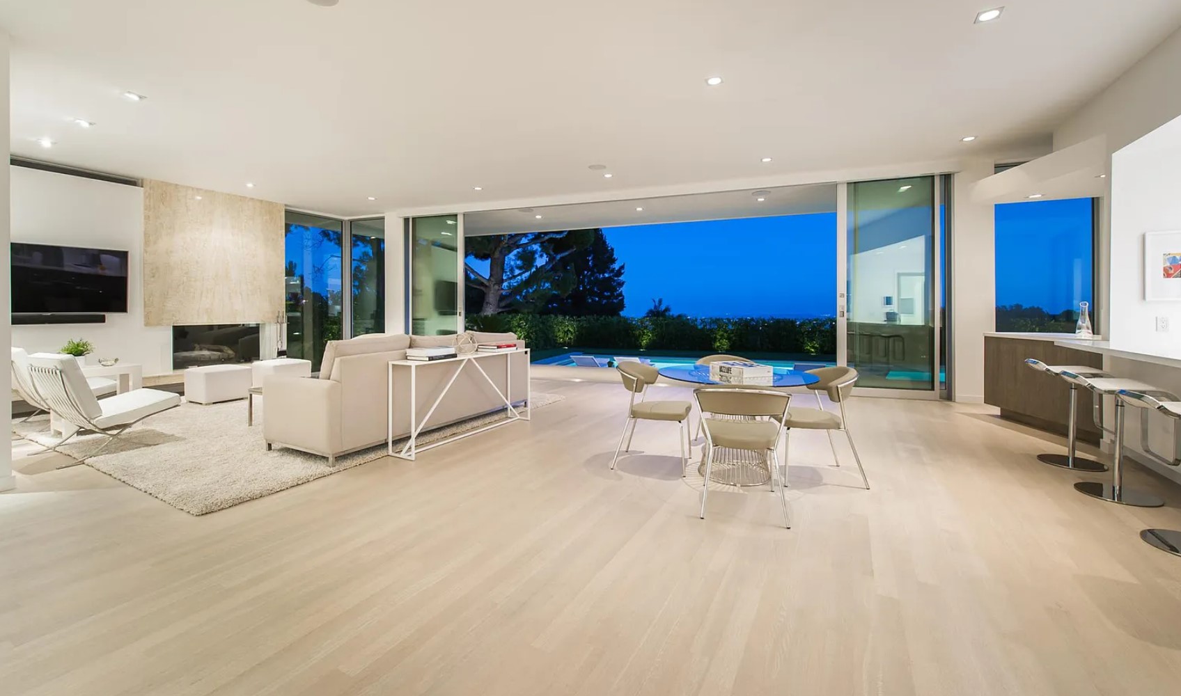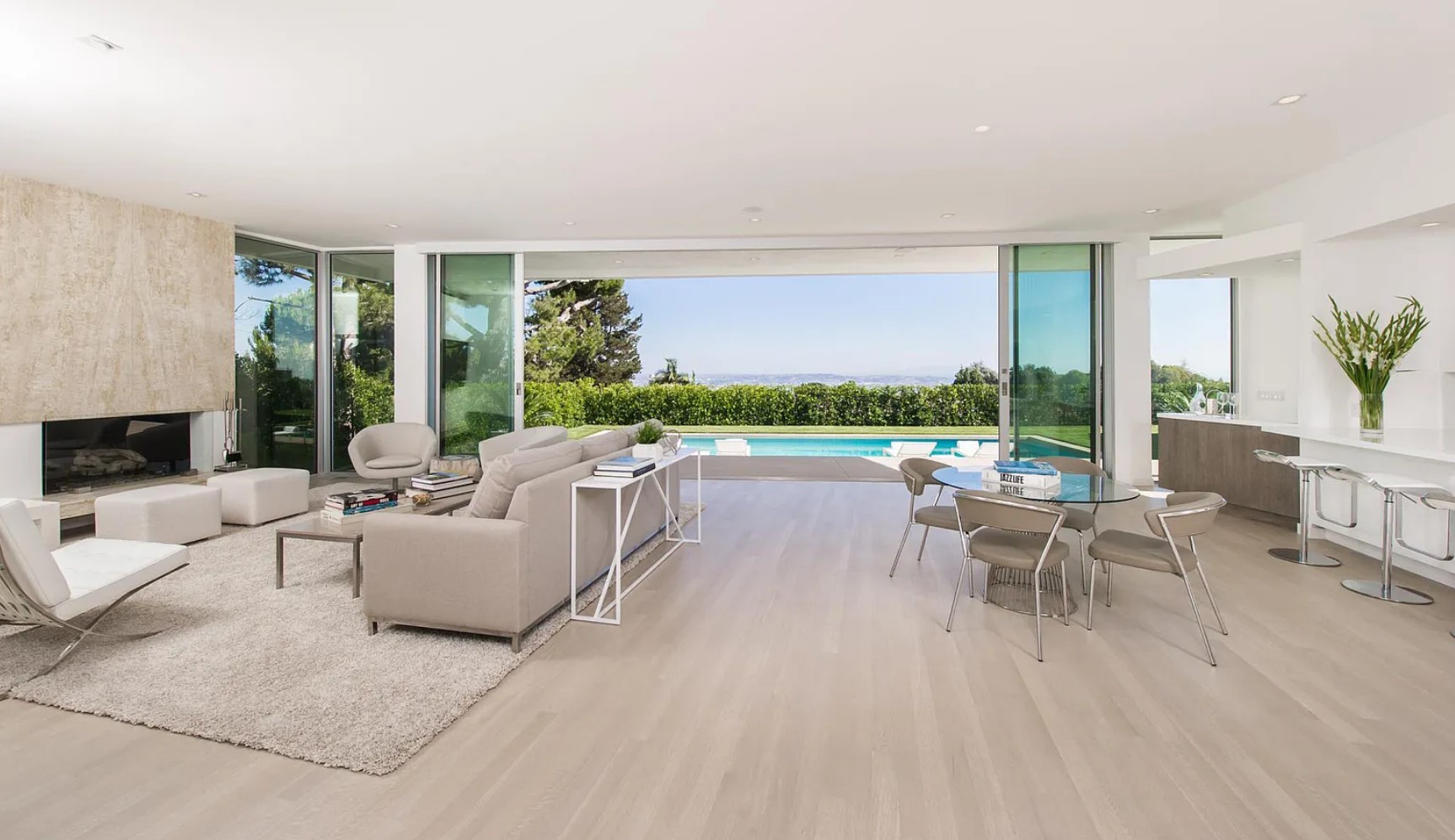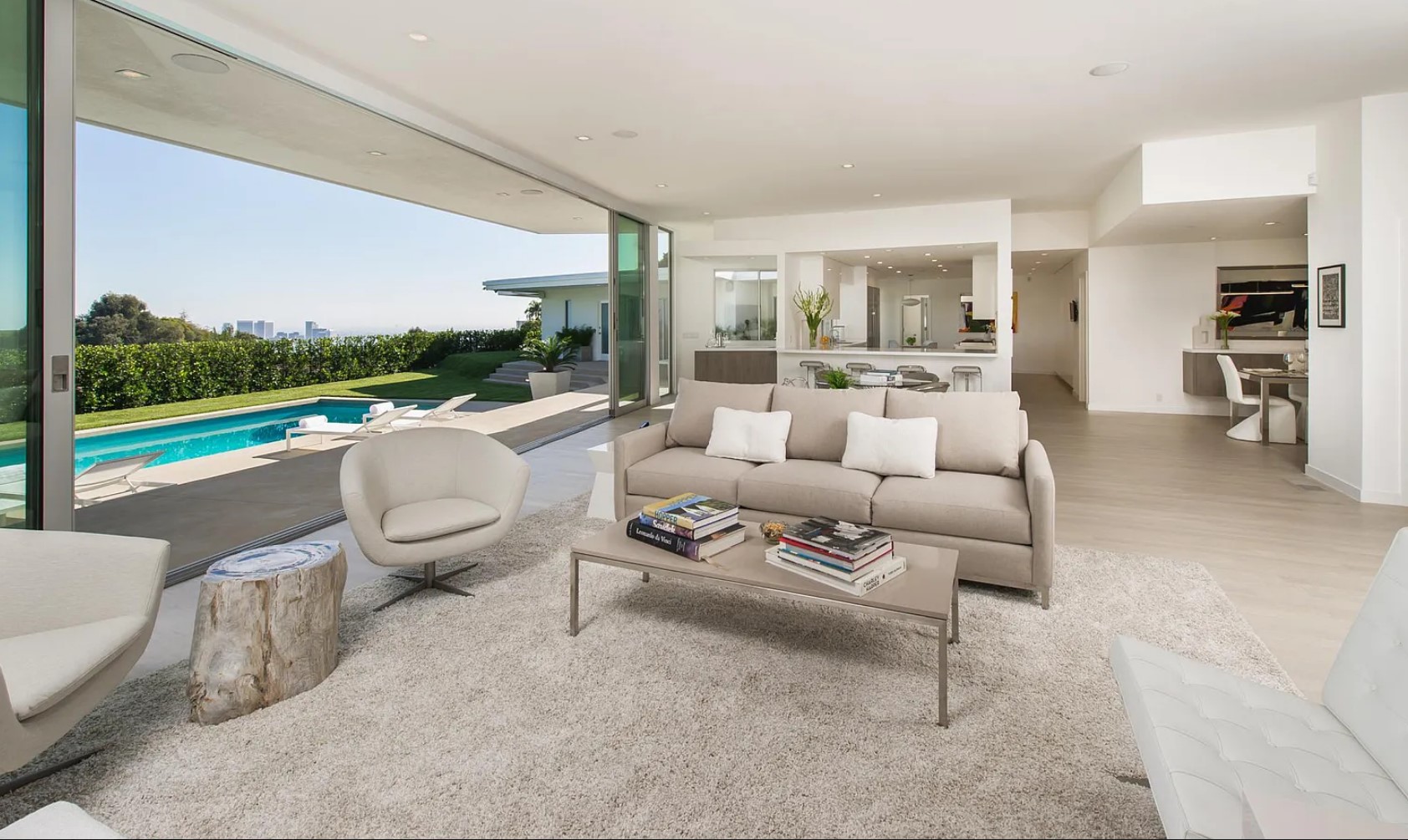 ภายในบ้านคุมโทนด้วยสีสว่างอย่างสีขาวเป็นหลัก พร้อมกับติดตั้งบานกระจกใสขนาดใหญ่ ก็ยิ่งทำให้บ้านมีทั้งความสว่าง และโปร่งสบายมีแสงสาดส่องเข้ามาได้อย่างเต็มที่ ส่วนการตกแต่งจะเลือกใช้เฟอร์นิเจอร์ที่เป็นวัสดุแปลกใหม่ นอกเหนือจากพื้นผิวธรรมชาติอย่างไม้ ปูน หิน ไปสู่สิ่งที่สังเคราะห์ขึ้นอย่าง กระจก พลาสติก โลหะ มามิกซ์แอนด์แมชท์ในสไตล์ Mid-Century ได้อย่างลงตัว นอกจากนี้ตรงสระว่ายน้ำยังได้มีการแบ่งเป็นโซน Jacuzzi ให้ได้ลงไปแช่แบบฟินๆ ในพื้นที่ส่วนตัวอย่างสบายใจ ท่ามกลางกลางธรรมชาติ และวิวทิวทัศน์ที่สวยงาม