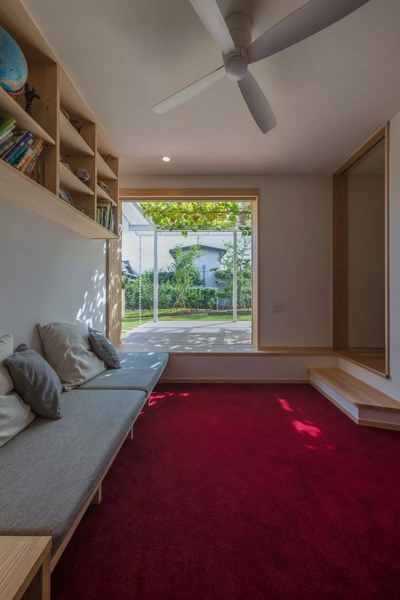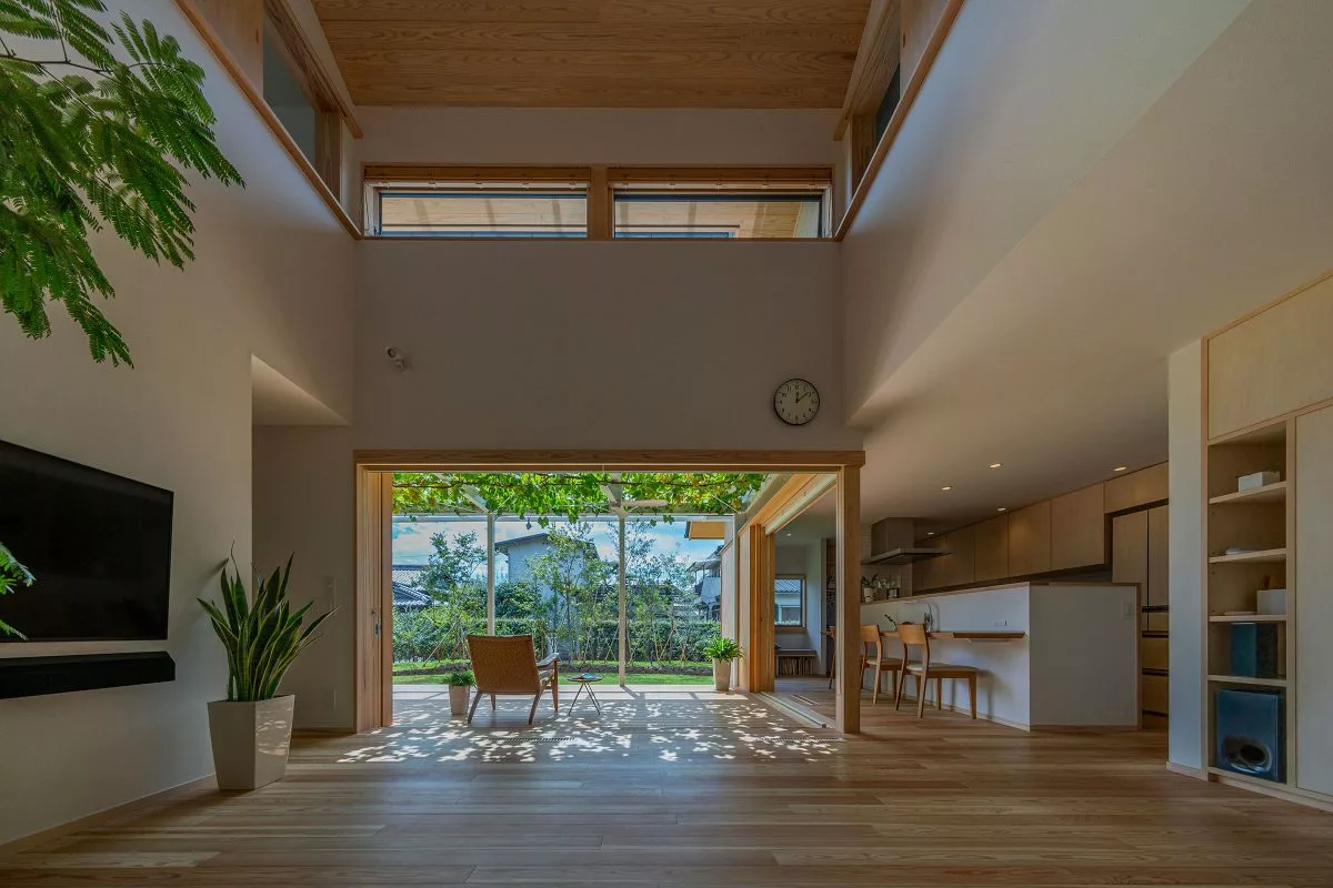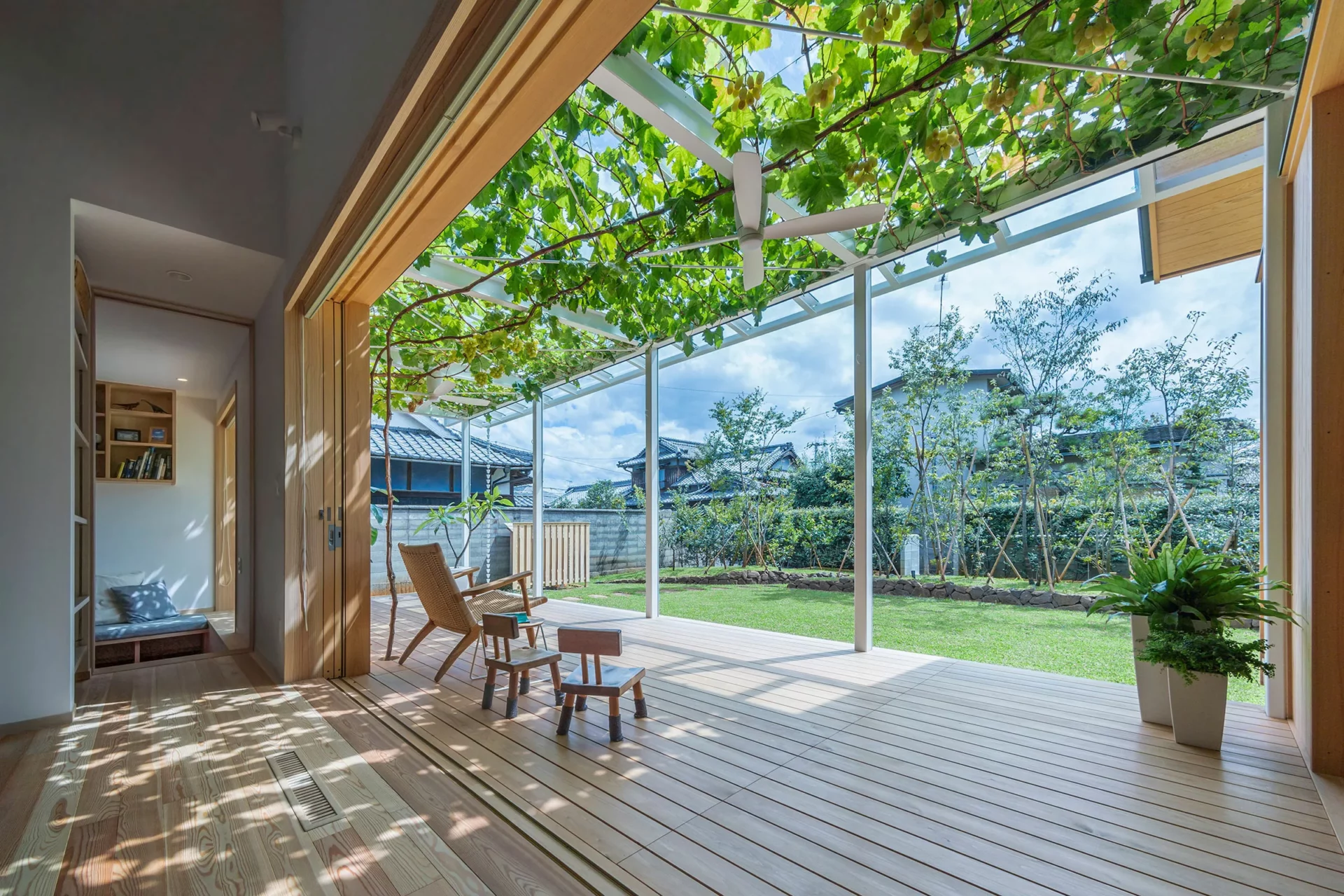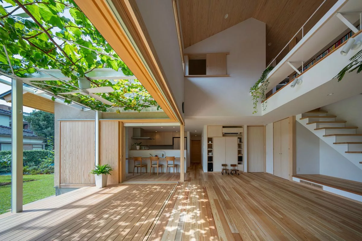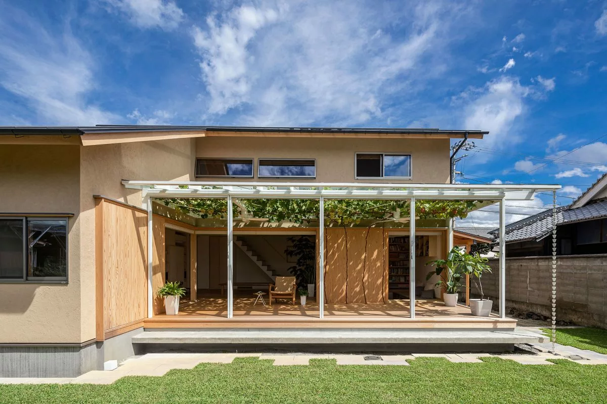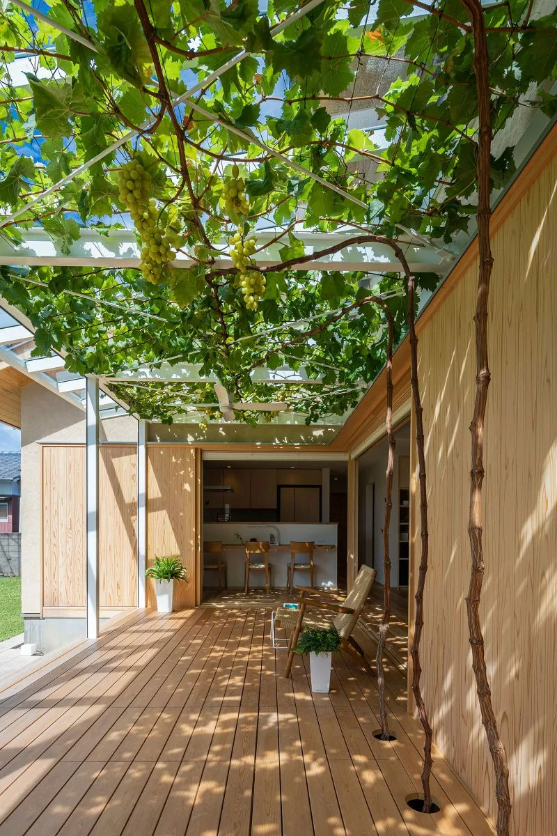 บ้านสองชั้นสไตล์มินิมอลหลังนี้ ตั้งอยู่ที่เมือง Matsuyama ประเทศญี่ปุ่น ออกแบบโดย Takashi Okuno อย่างเรียบง่าย เน้นการเลือกใช้วัสดุไม้สีอ่อนเป็นหลัก จุดเด่นของบ้านนี้ คือการทำเฉลียงออกมาให้กว้างๆ เพื่อให้คนในบ้านได้ออกมาพักผ่อน นั่งกินลมชมวิว ออกมาทำกิจกรรมร่วมกัน ซึ่งหลังคากันสาดถูกปกคลุมด้วยไม้เถา หรือต้นองุ่นนั่นเอง สามารถให้ทั้งความร่มรื่น เย็นสบาย และกินได้อีกด้วย