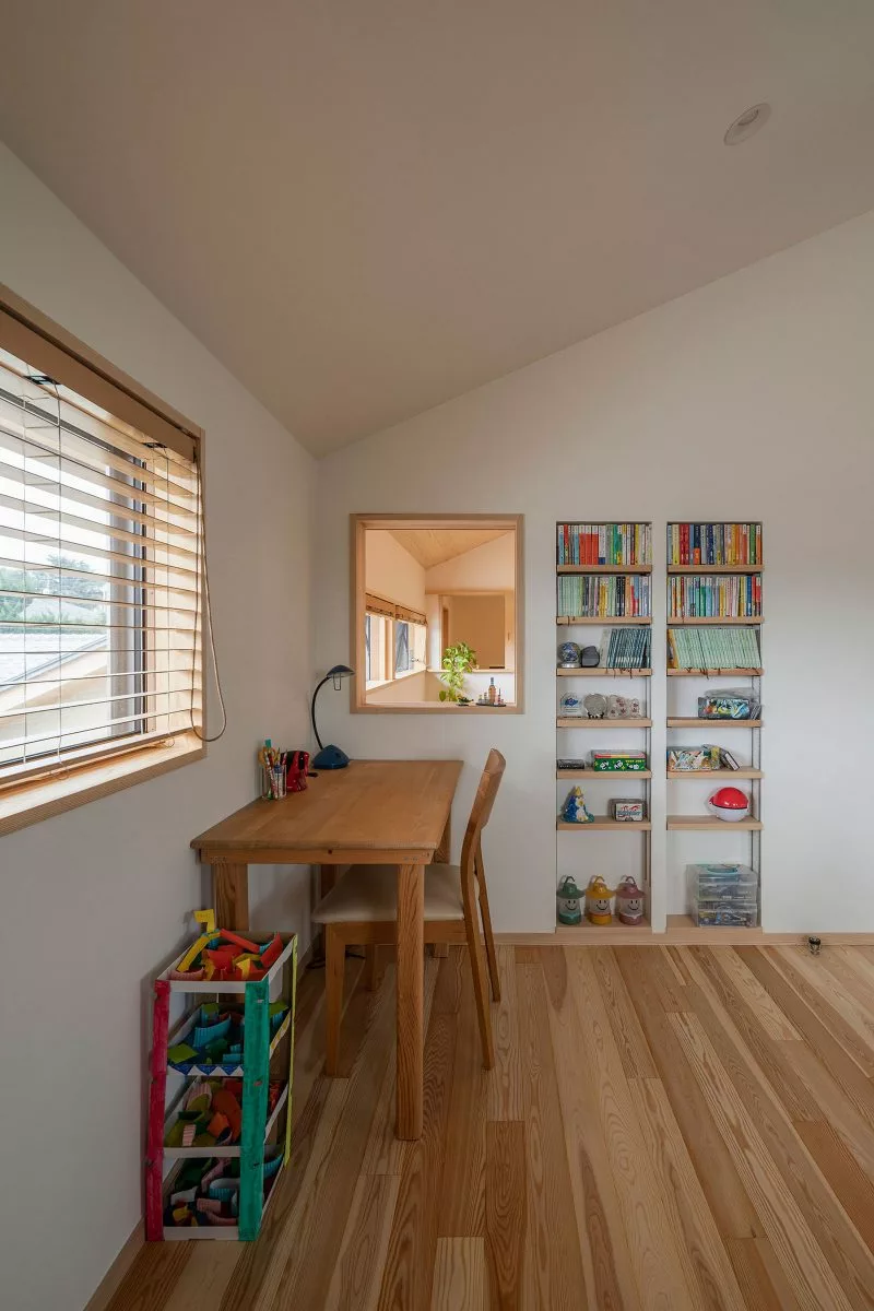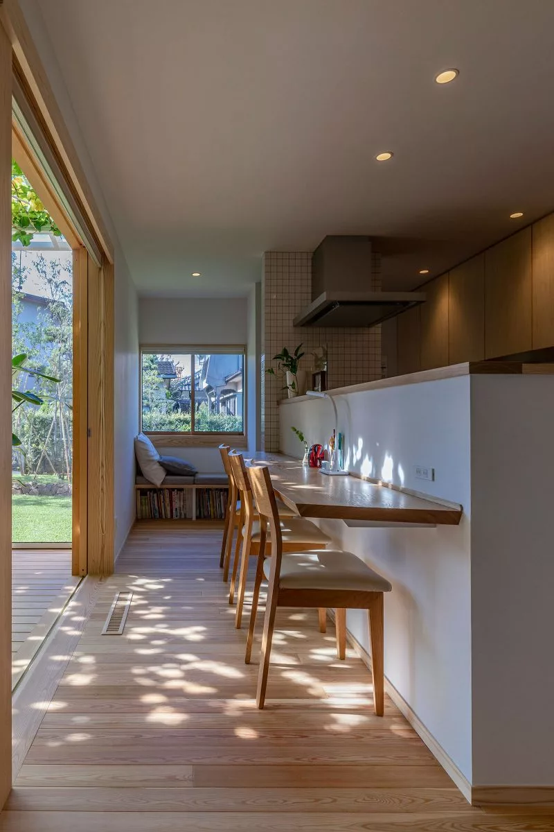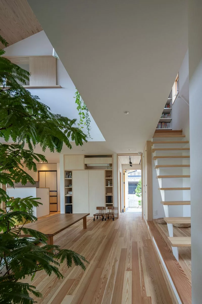 ส่วนภายในบ้านมีการตกแต่งแบบเรียบง่าย ดูอบอุ่น มีกลิ่นความเป็นโฮมมี่ผสมผสานเล็กน้อย ออกแบบให้บ้านโปร่งสบาย อากาศถ่ายเทได้สะดวก เน้นเลือกใช้เฟอร์นิเจอร์ไม้สีอ่อน ถึงแม้จะไม่ได้มีการแบ่งห้องด้วยกำแพง แต่มีการแบ่งโซนต่างๆ ได้อย่างเป็นสัดส่วน ด้านบนนอกจากจะมีห้องนอนแล้ว ก็มีมุมอ่านหนังสือที่สามารถนั่งห้อยขาลงมาได้ด้วย เป็นบ้านที่ถูกออกแบบ เพื่อให้ครอบครัวสามารถใช้เวลาร่วมกันได้อย่างคุ้มค่า อีกทั้งยังมีพื้นที่ให้สำหรับทำกิจกรรมร่วมกันอีกด้วย