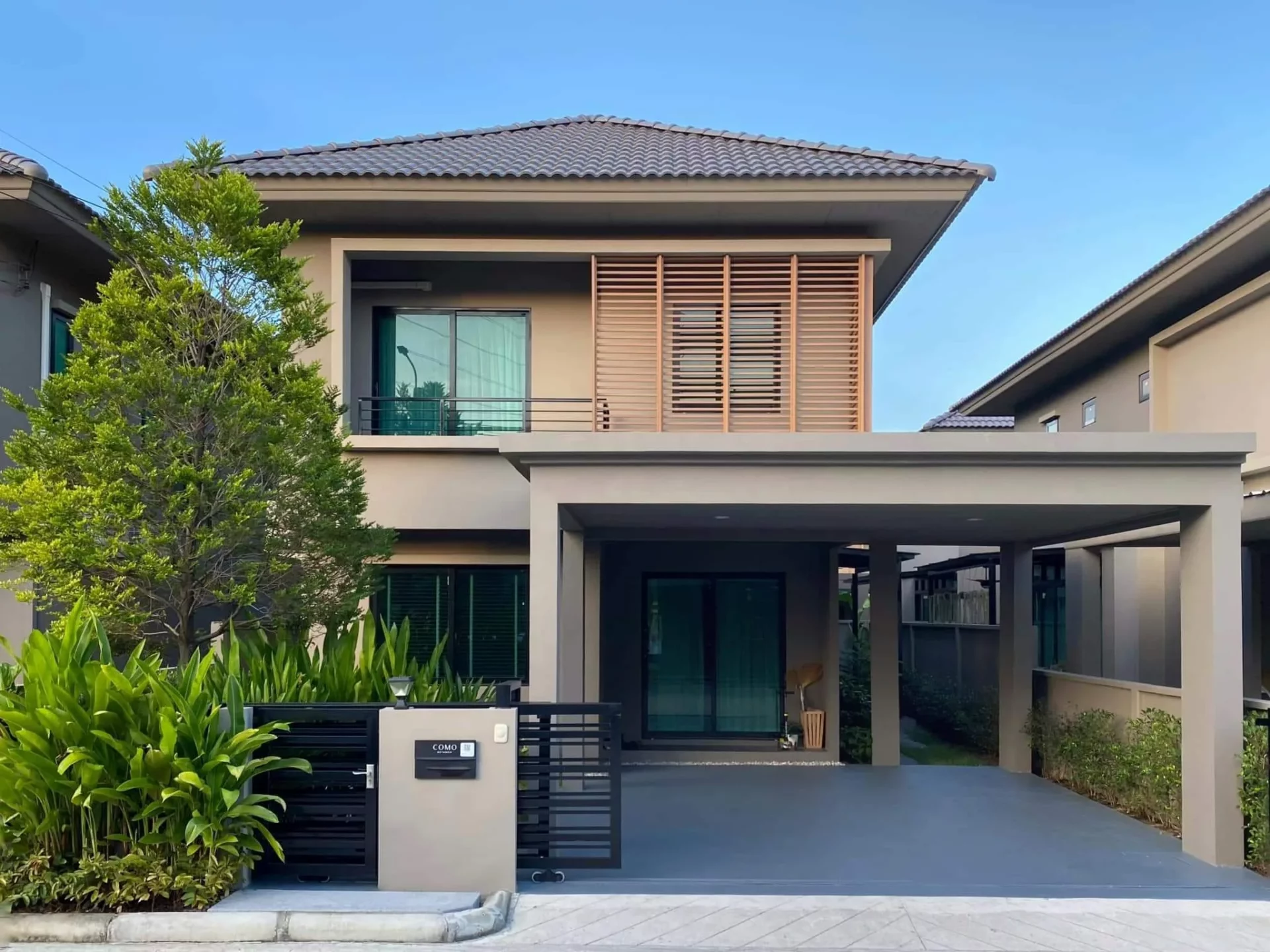 บ้านเดี่ยวสไตล์โมเดิร์น-มินิมอล มีการตกแต่งที่สวยงามด้วยโทนสีขาว ทำหลังคาบ้านเป็นทรงสโลปให้ดูทันสมัยมากขึ้น รั้วบ้านกับโรงจอดรถจะออกแบบให้มีความมินิมอ