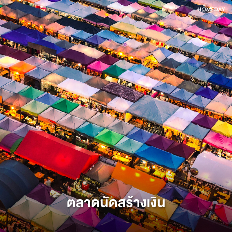 ตลาดนัดสร้างเงิน โมเดลธุรกิจตลาดนัดเติบโตอย่างมากจากกระแสโซเชียลที่สร้างสีสันของจุดขาย และการเป็นแหล่งรวมอาหารการกินและเสื้อผ้าของใช้ในราคาที่เป็นเจ้าของได้ง่ายเมื่อเทียบกับห้างสรรพสินค้า แต่ก็ต้องแลกมาด้วยอากาศร้อนที่ไม่มีแอร์เย็นฉ่ำไว้คอยให้บริการ ทำให้ตลาดนัดแหล่งชอปปิ้งของคนเมืองในยุคคนี้คึกคักอย่างมากในช่วงเวลาตอนค่ำไปจนถึงดึก