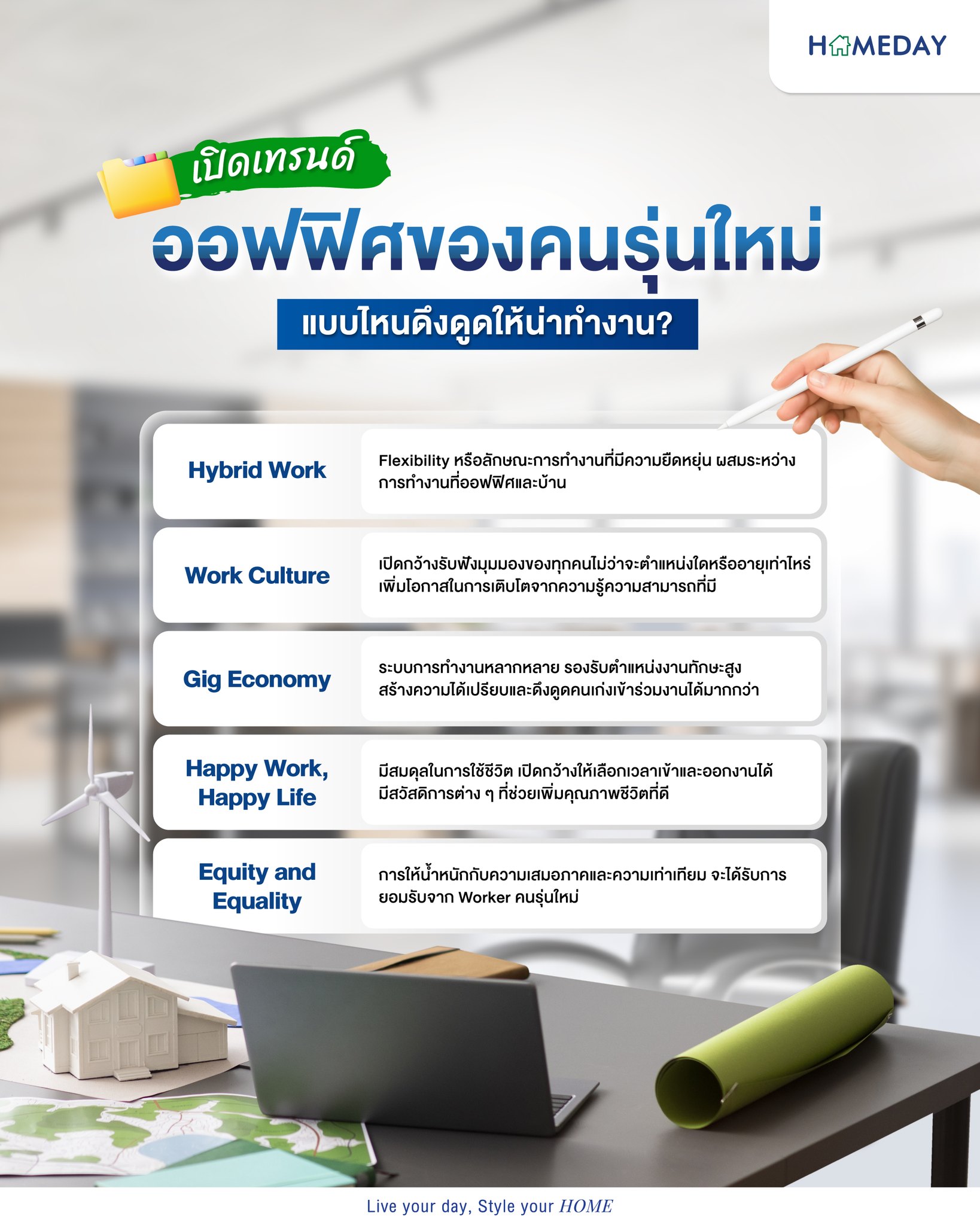 Hybrid Work การทำงานแบบผสมผสานระหว่างการเข้ามาทำงานที่ออฟฟิศ กับทำงานที่บ้าน อาจจะเป็นสัดส่วนการใช้เวลา 3 วันในออฟฟิศ แล้วอีก 2 วันทำงานนอกสถานที่ แบบนี้จะทำสร้างพื้นที่แห่งความยืดหยุ่นในการทำงาน โดยสามารถสร้างผลงานได้ดีกว่าการทำงานในรูปแบบเดิม ๆ นั่งประจำโต๊ะที่เรียงกันแน่นจนเต็มพื้นที่ ทัศนคติและมุมมองการทำงานในลักษณะนี้ได้รับการตอบรับจากชาว Gen Z มากขึ้นเรื่อย ๆ นับตั้งแต่หลังสถานการณ์โควิด-19 เป็นต้นมา เห็นได้จากเงื่อนไขบน LinkedIn เครือข่ายสังคมออนไลน์ที่จะระบุว่า “Flexibility” เพื่อแสดงถึงความต้องการสมัครงาน และเข้าทำงานใน Workplace ที่มีความยืดหยุ่นสูง