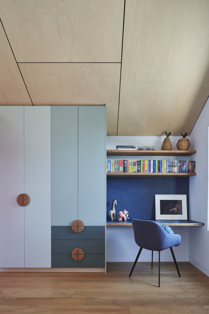 ภายในแบ่งโซนอย่างชัดเจน ตกแต่งแบบเรียบง่ายด้วยโทนสีจากธรรมชาติ เน้นความเป็นส่วนตัว สงบ และอบอุ่น นอกจากนี้ยังคงความสะดวกสบายต่อการใช้งานได้อย่างเหมาะสม หลังคาที่สูงยังช่วยให้ภายในตัวบ้านโปร่งโล่ง ช่วยให้ภายในอากาศถ่ายเทได้ดี แถมยังทำให้ห้องดูกว้างขวางมากยิ่งขึ้น ถัดไปที่ชั้นสองมีการตกแต่งห้องนอน และห้องน้ำสำหรับวัยซน ด้วยสีสันที่ไม่ฉูดฉาด ซึ่งมีส่วนช่วยให้กระตุ้นการมองเห็น และพัฒนาการทางอารมณ์ของเด็กๆ ได้เป็นอย่างดี ส่วนสระว่ายน้ำหลังบ้านก็เป็นอีกจุดสำคัญที่จะตอบโจทย์กับครอบครัวใหญ่ที่มีสมาชิกในทุกๆวัย สามารถทำกิจกรรมร่วมกันได้อย่างสนุกสนาน และผ่อนคลายไปในเวลาเดียวกัน