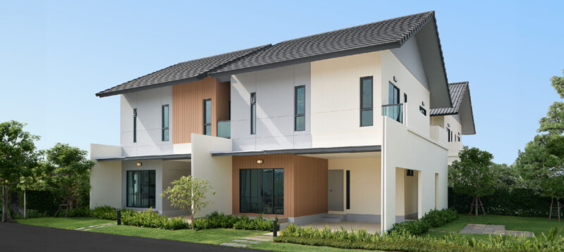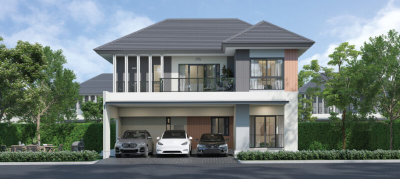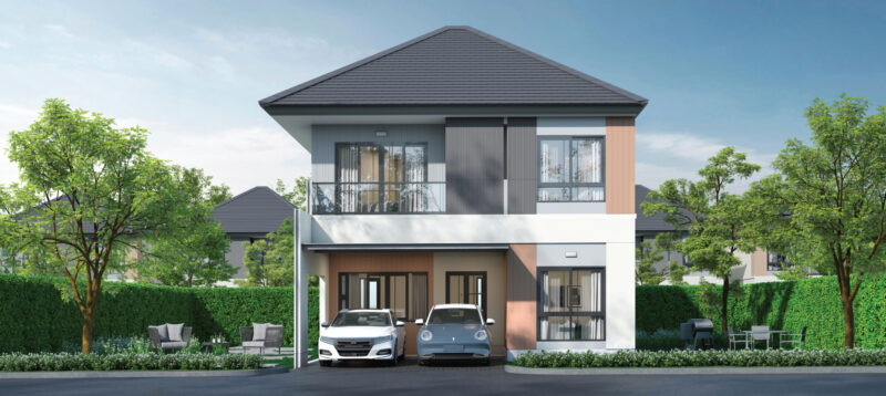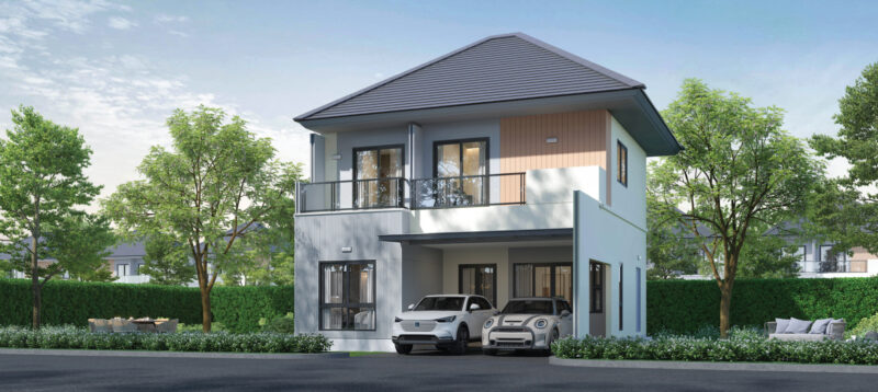 พื้นที่ใช้สอย 154 ตร.ม. ฟังก์ชันบ้าน 3 ห้องนอน, 3 ห้องน้ำ, 1 ห้องครัว พร้อมที่จอดรถ 2 คัน