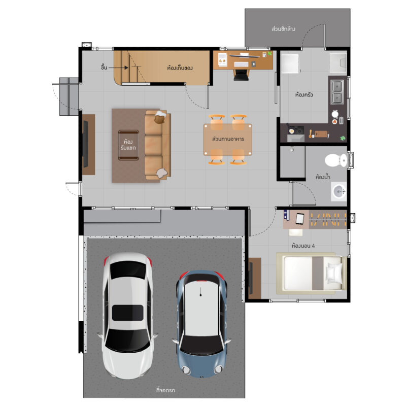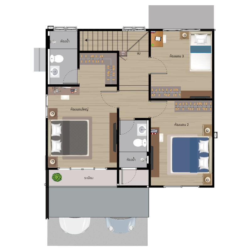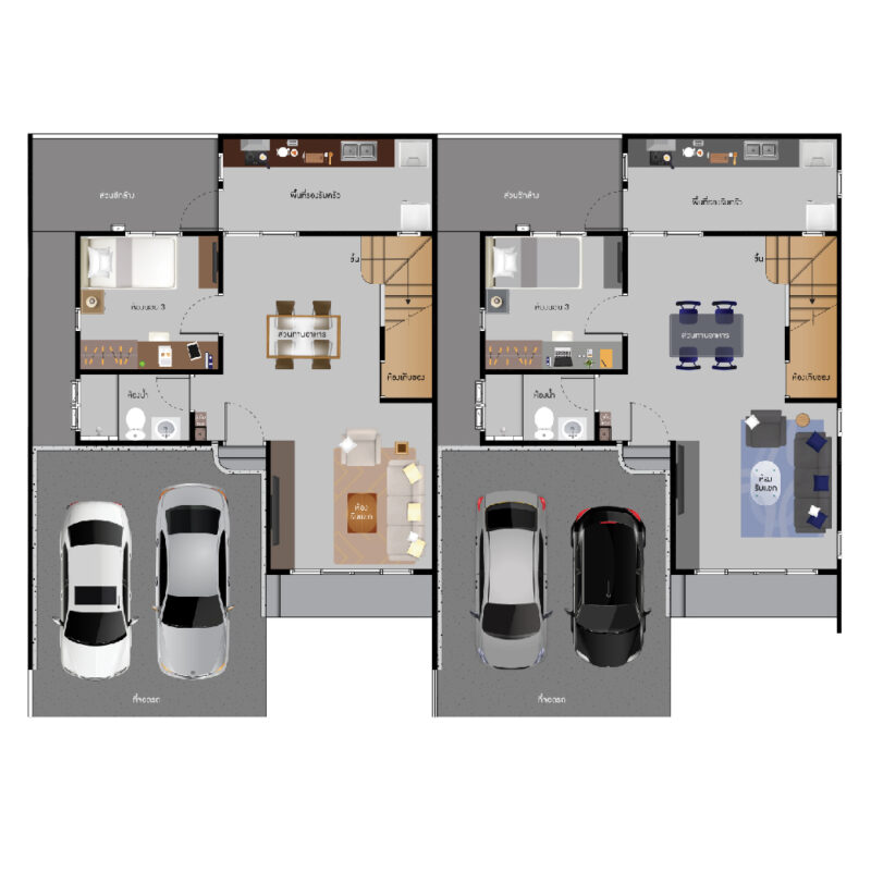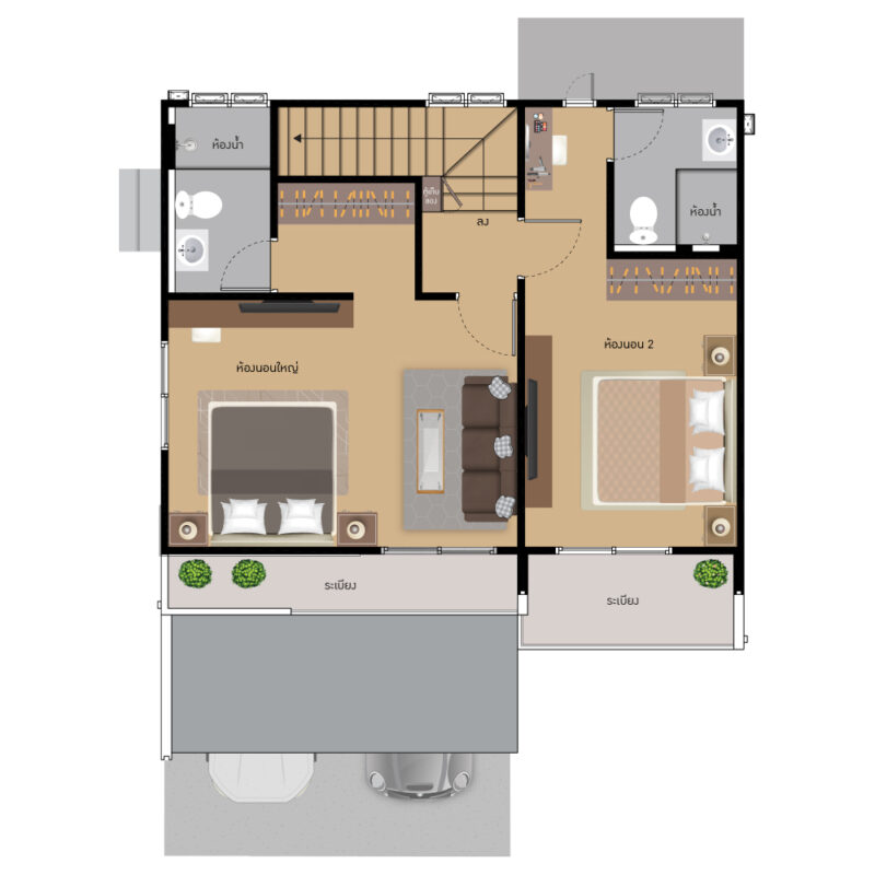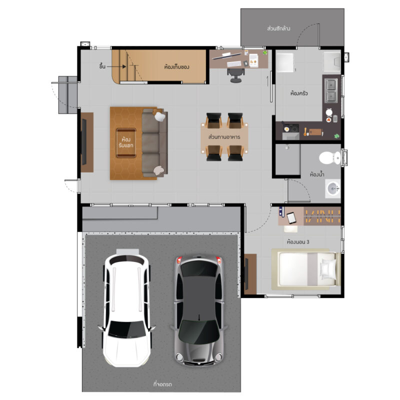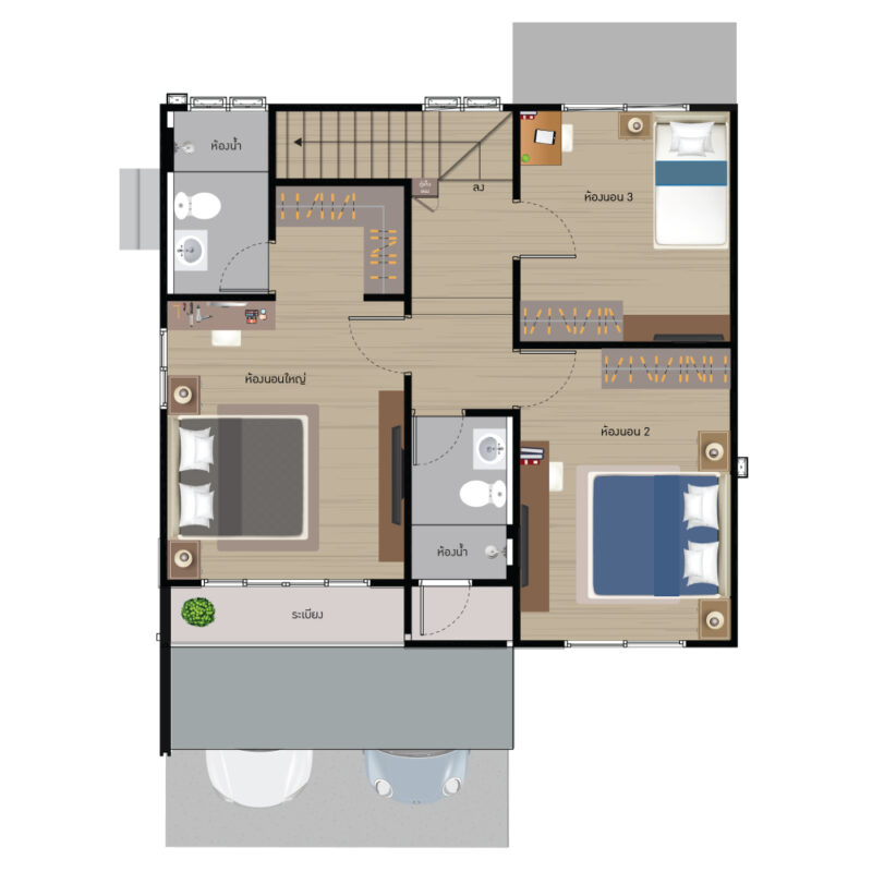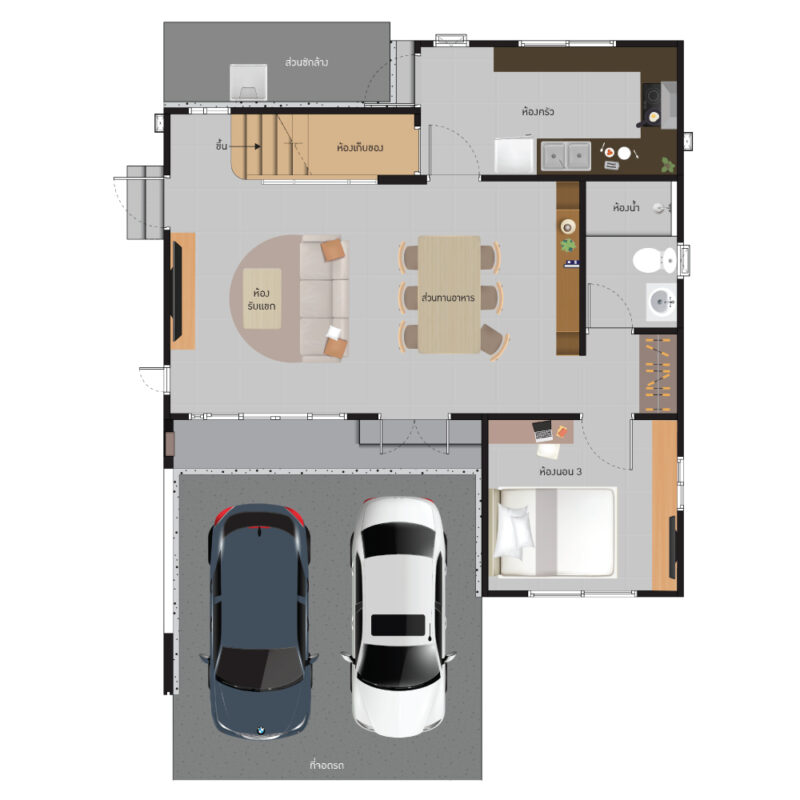 พื้นที่ใช้สอย 155 ตร.ม. ฟังก์ชันบ้าน 3 ห้องนอน, 3 ห้องน้ำ, 1 ห้องครัว พร้อมที่จอดรถ 2 คัน