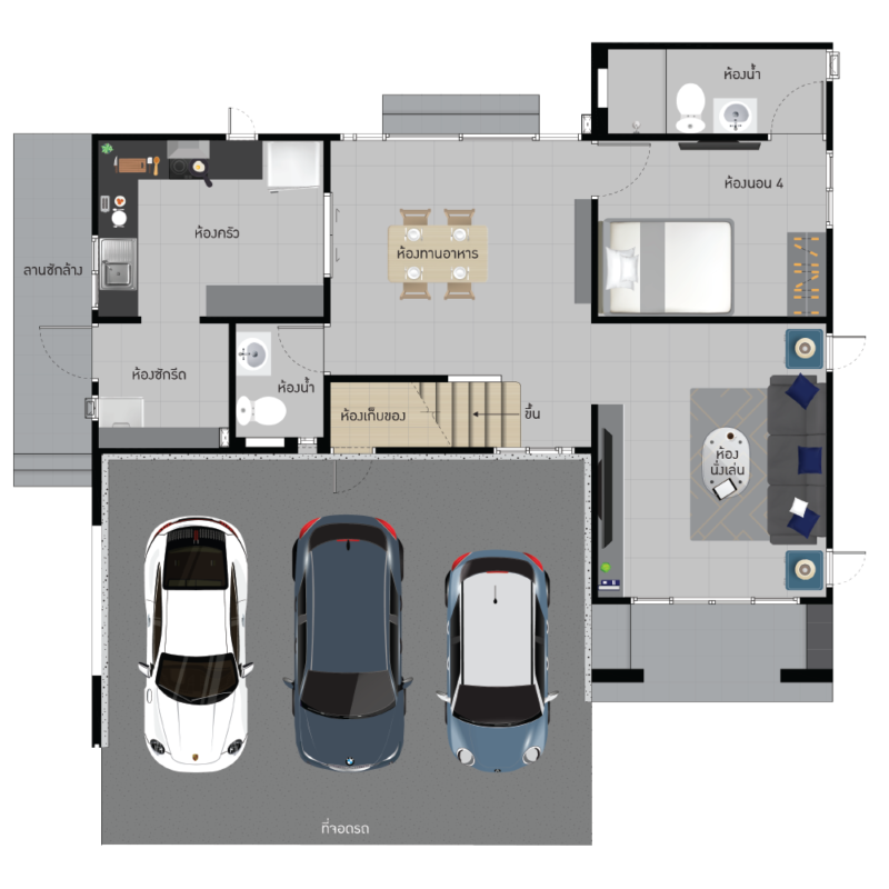พื้นที่ใช้สอย 164 ตร.ม. 4 ห้องนอน, 3 ห้องน้ำ, 1 ห้องครัว พร้อมที่จอดรถ 3 คัน