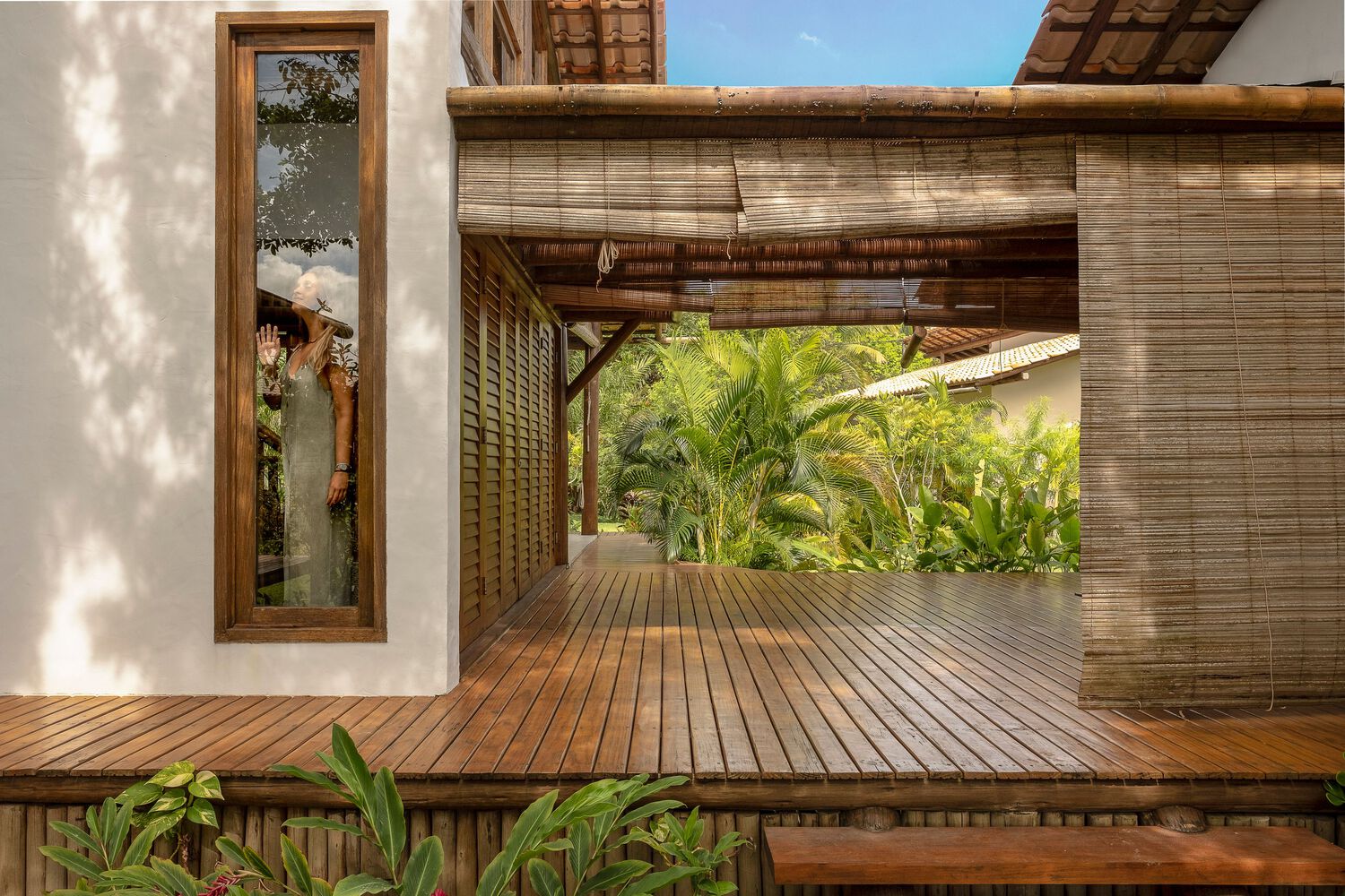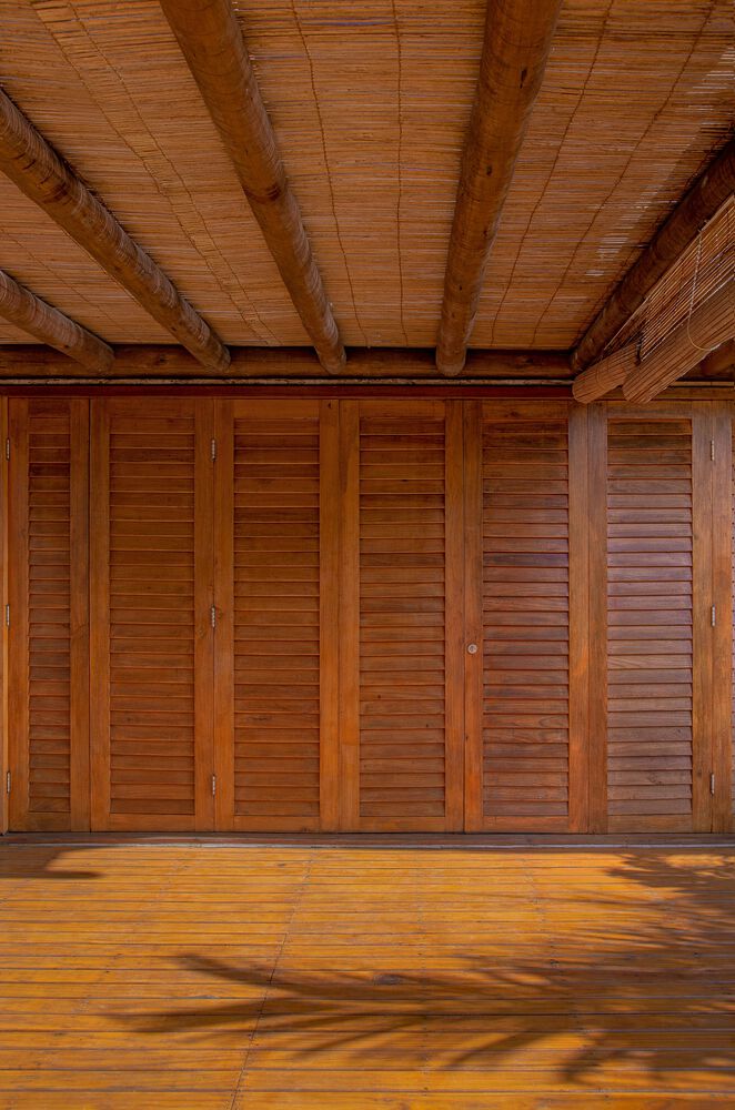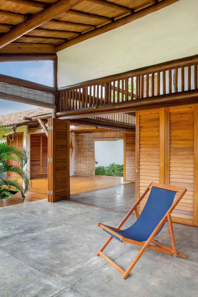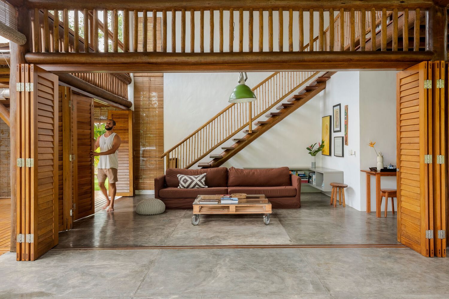 โครงสร้างบ้านหลังนี้ถูกออกแบบอย่างเรียบง่ายเป็นสองหลัง สร้างจากวัสดุธรรมดาที่ดีไซน์เรียบง่ายไม่ซับซ้อน แต่ทุกอย่างที่เลือกใช้ล้วนเหมาะกับสภาพภูมิอากาศอย่างลงตัว มีหลังคาหน้าจั่วเชื่อมถึงกัน และเฉลียงไม้ที่ยื่นออกมาเป็นพื้นที่สำหรับใช้ชีวิตนอกบ้าน ให้ผิวกายได้สัมผัสกับสายลมแสงแดด ชมวิวทิวทัศน์เพลิดเพลินไปกับธรรมชาติ นอกจากนี้ยังติดตั้งประตูบานเฟี๊ยมไม้แบ่งสัดส่วน หรือกั้นห้องได้อย่างมีมิติ สามารถเปิดกว้างให้กลมกลืนเป็นส่วนหนึ่งกับธรรมชาติได้อย่างใกล้ชิด อากาศถ่ายเทสะดวก มีลมโกรกไปมา สร้างบรรยากาศในแต่ละวันแบบไม่จำเจ