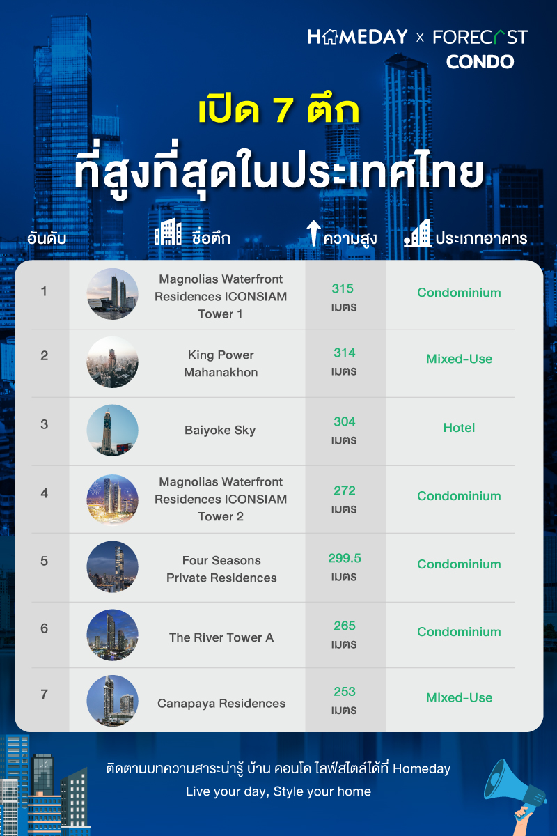 เป็นอย่างไรกันบ้างคะ กับทั้ง 7 ตึกที่สูงที่สุดในประเทศไทย ที่วันนี้เรารวบรวมข้อมูลนำมาให้ทุกคนได้อ่านกัน จะเห็นได้เลยว่าส่วนใหญ่จะเป็นคอนโดมิเนียมใจกลางกรุงระดับ Super Luxury ทั้งนั้น บางแห่งก็เป็นที่พักอาศัยอย่างเดียวแต่บางแห่งนอกจากเป็นที่พักอาศัยแล้ว ยังเป็นร้านอาหาร เป็นพื้นที่ชมวิวและพักผ่อนสำหรับคนภายนอกด้วย หากใครอยากลองสัมผัสบรรยากาศตึกสูงริมแม่น้ำเจ้าพระยา ก็ลองหาเวลาว่างไปกันดูนะคะ