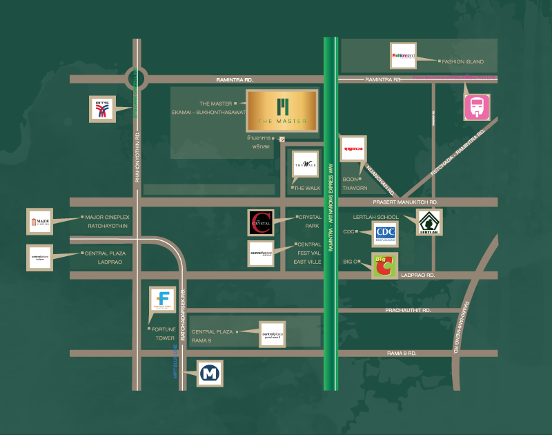 ห้างสรรพสินค้าFashion Island 5.5 กม.The Promenade 8.2 กม.Big C หทัยราษฎร์ 3.9 กม. สถานที่ใกล้เคียงสถานปั่นจักรยานเจริญสุขมงคลจิต 11.8 กม.วินด์เซอร์ปาร์ค แอนด์ กอล์ฟคลับ 11.8 กม.นิคมอุตสาหกรรมลาดกระบัง 1.2 กม.สนามบินสุวรรณภูมิ 13.4