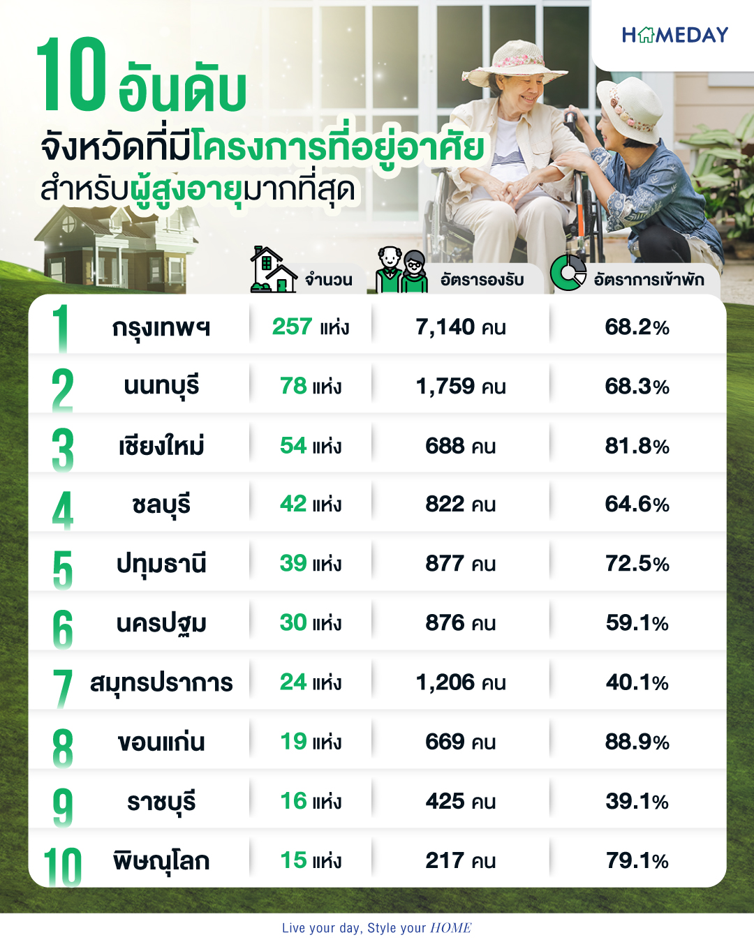 ศูนย์ข้อมูลอสังหาริมทรัพย์ พบโครงการที่อยู่อาศัยสำหรับผู้สูงอายุในไทย 574 แห่ง คิดเป็น 75.7% ของที่อยู่อาศัยผู้สูงอายุทั้งหมด โดยกระจายตัวอยู่ใน 10 จังหวัด ดังต่อไปนี้