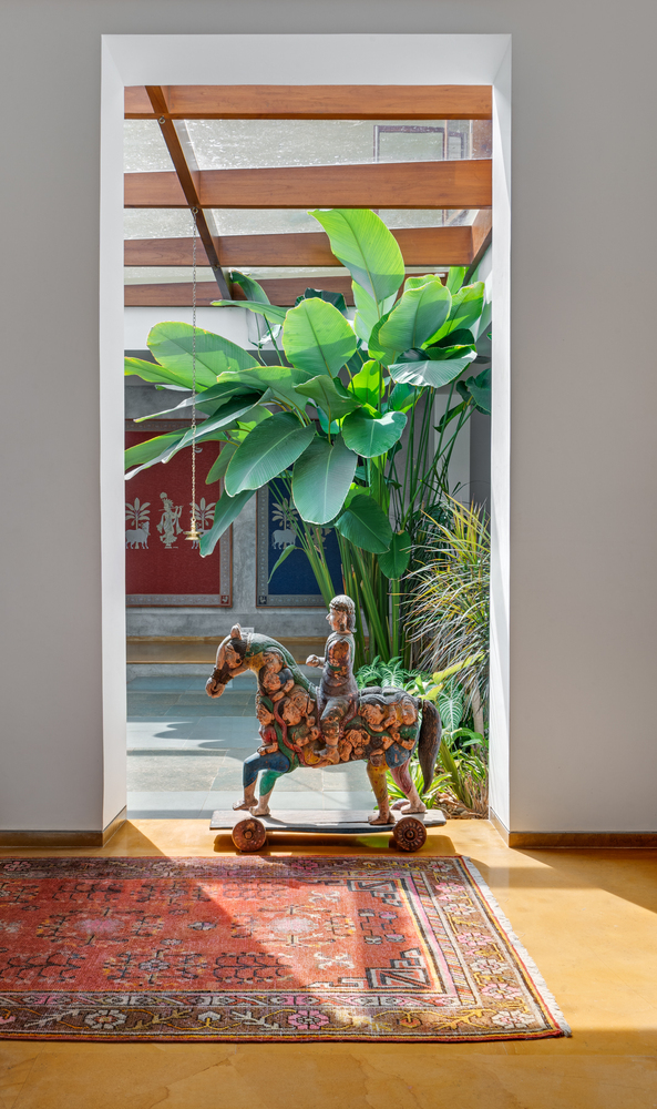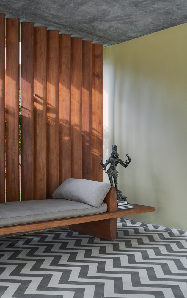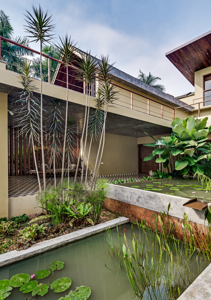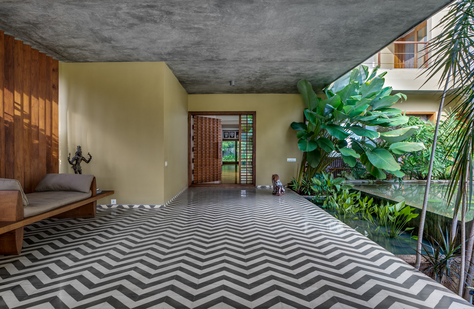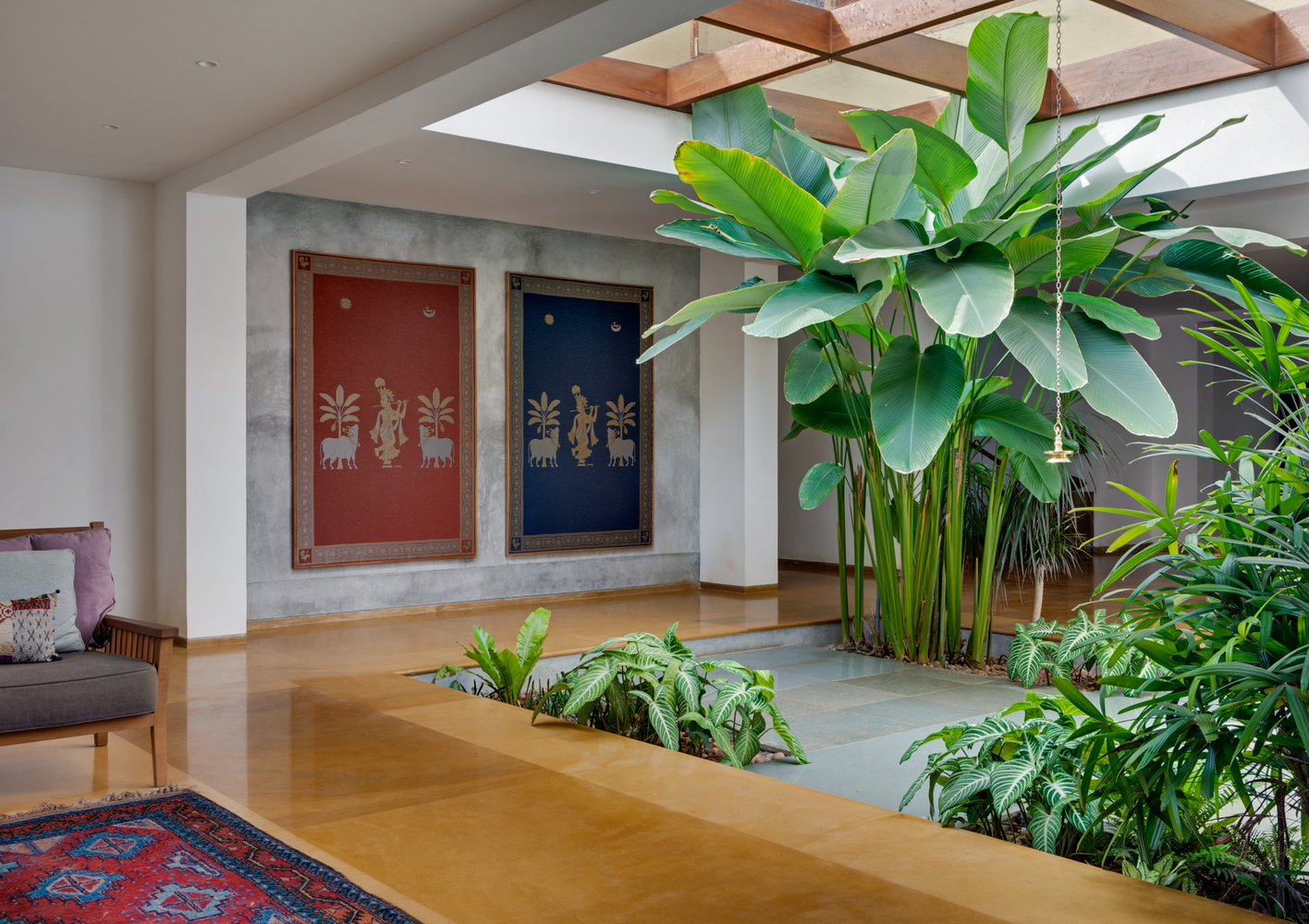 ไอเดียแต่งบ้านหลังนี้ เป็นผลงานจาก Khosla Associates ตั้งอยู่ที่ประเทศอินเดีย ซึ่งเป็นการออกแบบโดยการใช้น้ำ และหินทรายสีเหลืองอย่าง Jaisalmer ตกแต่งเป็นองค์ประกอบหัวใจหลักของบ้าน ทั้งนี้ตัวบ้านตั้งอยู่ในเขตพื้นที่ร้อนชื้น จึงได้มีการออกแบบตัวบ้านให้สอดคล้องกับสภาพภูมิอากาศได้อย่างดีเยี่ยม และลงตัวในทุกฤดู