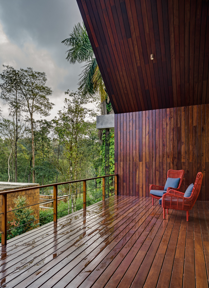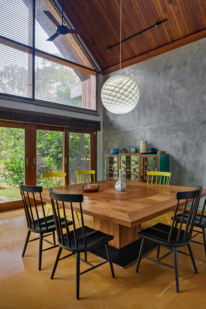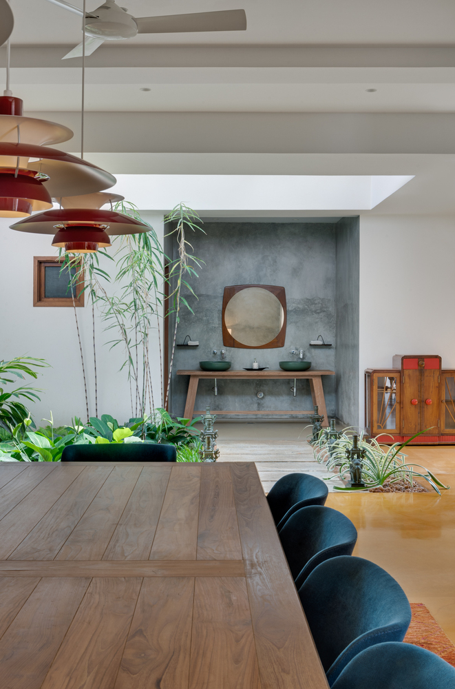 ภายในตกแต่งด้วยเฟอร์นิเจอร์สบายๆ เน้นใช้งานสะดวก เหมาะกับบรรยากาศ และอากาศร้อนชื้น ทั้งนี้ยังเลือกใช้วัสดุธรรมชาติ และเน้นการออกแบบให้บ้านมีพื้นที่โปร่งโล่ง พร้อมมีหน้าต่างหลายจุด เพื่อให้แสงแดดสาดส่องเข้าไปในบ้านได้อย่างทั่วถึง ช่วยให้ถ่ายเทอากาศได้ดีกว่าปกติ นอกจากนี้ยังคงเป็นบ้านอีกหลังที่สร้างขึ้นมาด้วยการผสมผสานตัวบ้านให้เข้ากับสวนหย่อมอันเขียวชอุ่มบริเวณรอบๆ พร้อมกับต้นไม้นานาชนิด และสายน้ำเข้าด้วยกันอย่างสมบูรณ์แบบ