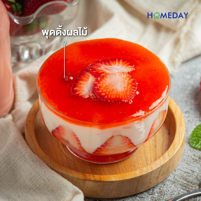 • ตักใส่ถ้วยและนำไปแช่เย็นจนเนื้อพุดดิ้งเซตตัว ตกแต่งหน้าพุดดิ้งด้วยโยเกิร์ตและผลไม้สด