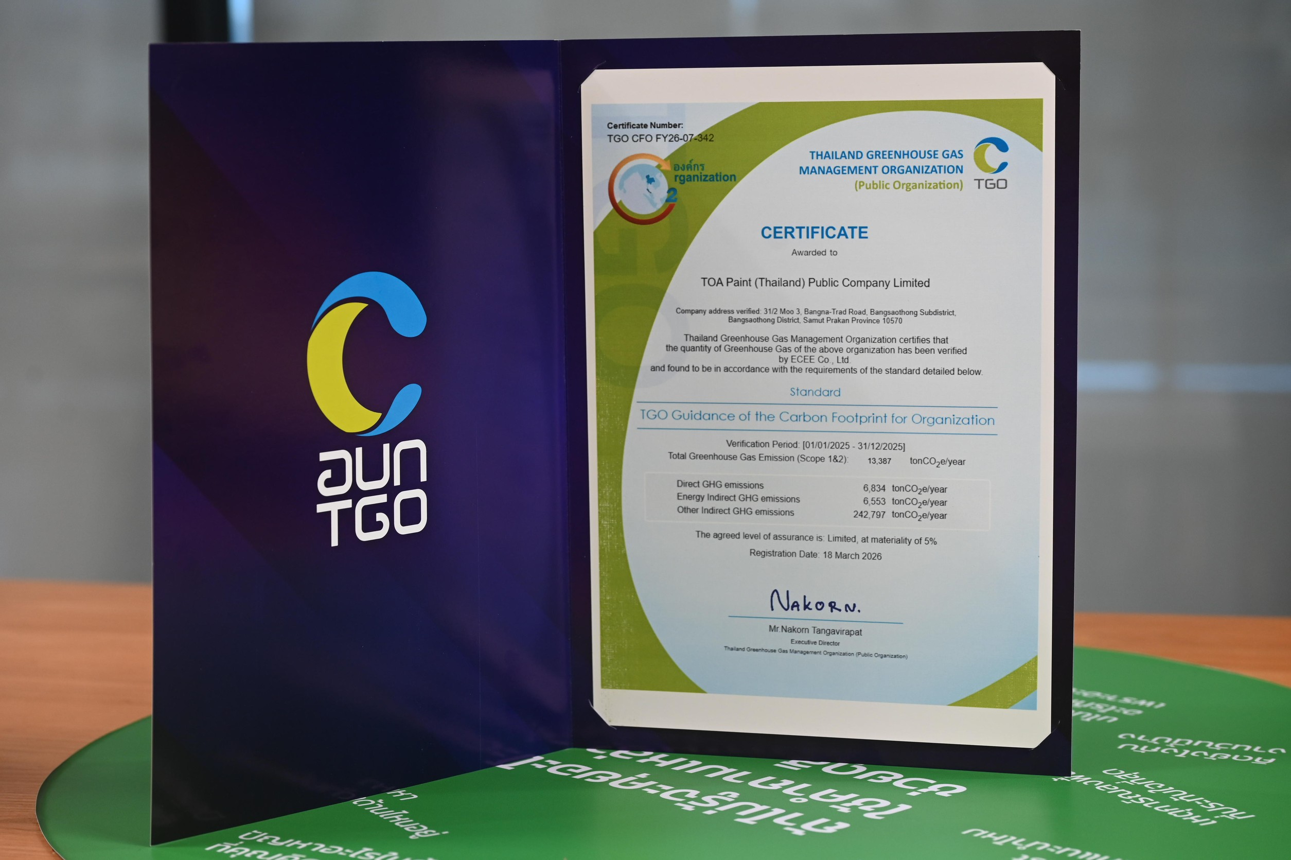 บริษัท ทีโอเอ เพ้นท์ (ประเทศไทย) จำกัด (มหาชน) หรือ TOA ผู้นำอุตสาหกรรมสีอันดับ 1 เคมีภัณฑ์ก่อสร้าง และวัสดุตกแต่งพื้นผิวของไทย ตอกย้ำความสำเร็จอย่างต่อเนื่องในการดำเนินธุรกิจควบคู่กับการดูแลสิ่งแวดล้อม เดินหน้าองค์กร Net Zero อย่างเป็นรูปธรรม ล่าสุดได้รับประกาศนียบัตร ‘การรับรองคาร์บอนฟุตพริ้นท์ขององค์กร (Carbon Footprint for Organization: CFO)’ โดยมี นายจตุภัทร์ ตั้งคารวคุณ ประธานเจ้าหน้าที่บริหาร TOA เข้ารับมอบประกาศนียบัตรจาก ดร.วิจารย์ สิมาฉายา ประธานกรรมการองค์การบริหารจัดการก๊าซเรือนกระจก (องค์การมหาชน) หรือ อบก. และมี นายณกรณ์ ตรรกวิรพัท ผู้อำนวยการ อบก. ร่วมแสดงความยินดี ณ สถาบันเพื่อการยุติธรรมแห่งประเทศไทย หรือ TIJ