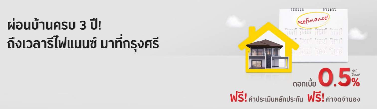 สำหรับธนาคารกรุงศรีอยุธยา มีอัตราดอกเบี้ยสินเชื่อในการรีไฟแนนซ์บ้านเฉลี่ยต่ำสุด 3 ปีอยู่ที่ 2.75% โดยจะมีการให้วงเงินสูงสุดที่ 95%