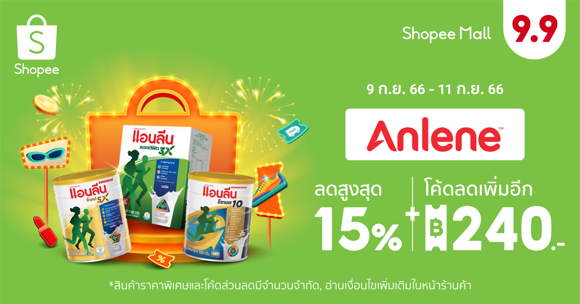 ร่วมฉลองมหกรรมที่ยิ่งใหญ่ที่สุด Shopee 9.9 วันช้อปแห่งปี แอนลีนถือโอกาสนี้ส่งต่อความห่วงใยให้คนในครอบครัวที่คุณรัก ด้วยส่วนลดสูงสุด 15% และ โค้ดลดเพิ่มอีก 240 บาท ในช่วงมหกรรม Shopee 9.9 วันช้อปแห่งปี ตั้งแต่ 4 – 11 กันยายน 2566