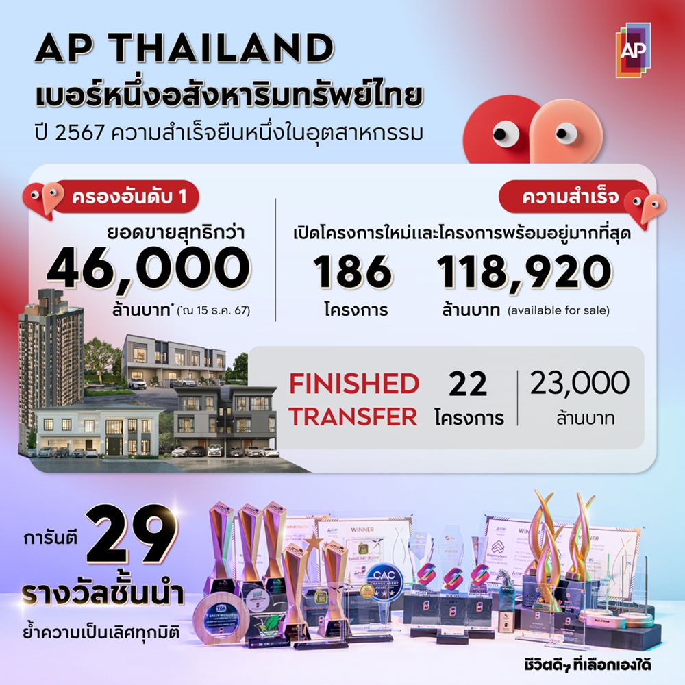 ปี 2567 เป็นอีกหนึ่งปีแห่งความสำเร็จอย่างยิ่งใหญ่ของเอพี ด้วยการคว้า 29 รางวัลอันทรงเกียรติระดับประเทศและภูมิภาค สะท้อนให้เห็นถึงความเป็นผู้นำที่โดดเด่นในทุกมิติ ไม่ว่าจะเป็นการได้รับ 12 รางวัลสูงสุดในกลุ่มธุรกิจอสังหาริมทรัพย์ยอดเยี่ยมแห่งปีจากหลากหลายเวทีชั้นนำระดับประเทศและภูมิภาค หรือ 4 รางวัลอันทรงเกียรติในกลุ่มซีอีโอและความเป็นเลิศในการบริหารการเงินแห่งปีจากงานIAA Awards for Listed Companies 2567 และงาน LivingInsider Developer Awards 2567