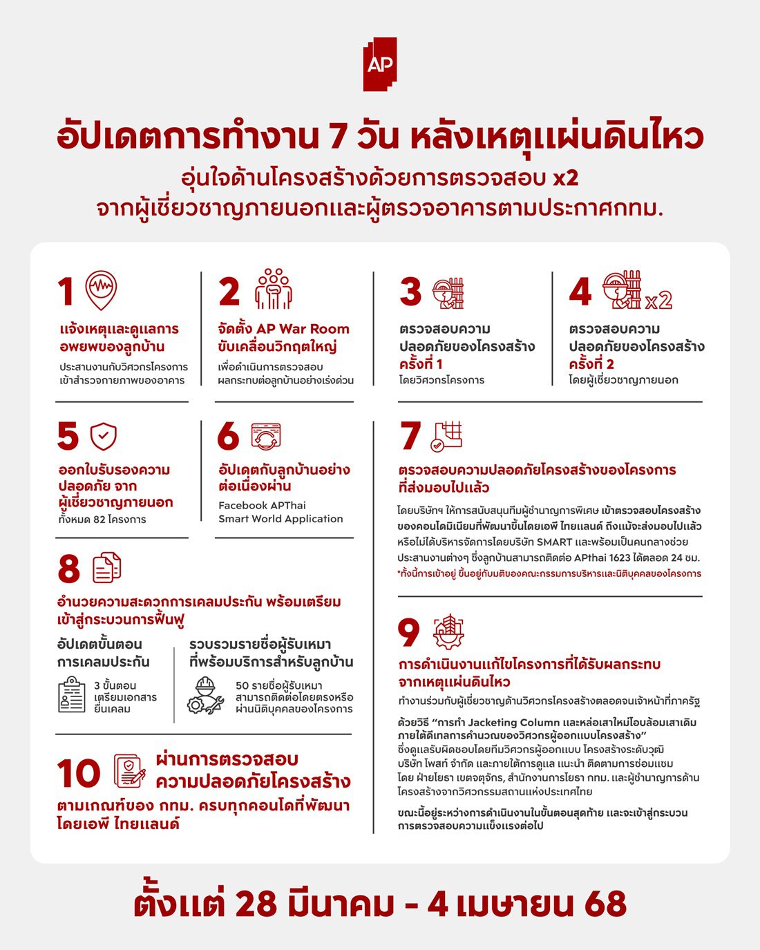 พร้อมระดมทุกสรรพกำลัง เพื่อสนับสนุนให้ลูกบ้านทุกท่านผ่านเหตุการณ์นี้ไปได้อย่างปลอดภัย มั่นใจ และได้รับการดูแลในทุกมิติ ทั้งด้านกายภาพของอาคาร และความสบายใจ อุ่นใจในการอยู่อาศัย สำหรับแนวทางการดำเนินงานของเอพีตลอด 7 วันที่ผ่านมา ภายหลังเกิดเหตุแผ่นดินไหว เป็นการดำเนินการอย่างเข้มข้น ภายใต้การระดมทรัพยากรทั้งบุคลากรและความเชี่ยวชาญในทุกด้าน เพื่อขับเคลื่อน 10 ขั้นตอนสำคัญ ดังนี้