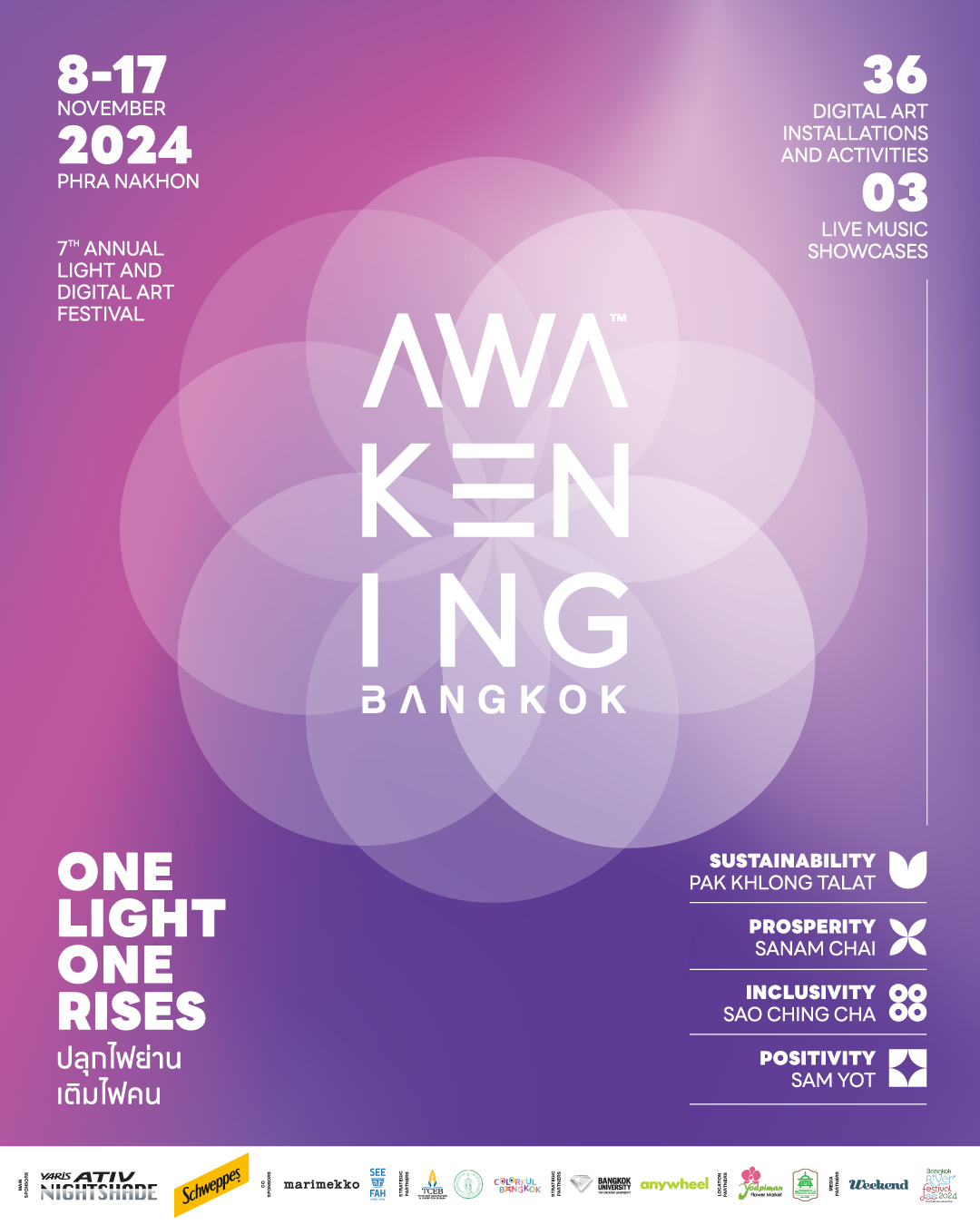 คณะผู้จัดงานเทศกาล Awakening Festivals ร่วมกับ กรุงเทพมหานคร, การท่องเที่ยวแห่งประเทศไทย (ททท.), สํานักงานส่งเสริมการจัดประชุมและนิทรรศการ (องค์การมหาชน) หรือ ทีเส็บ, โตโยต้า มอเตอร์ ประเทศไทย, เครื่องดื่มชเวปส์, มารีเมกโกะ ไทยแลนด์, สีฟ้า ตลอดจนพันธมิตรทั้งภาครัฐและเอกชน จับมือสร้างปรากฏการณ์แห่งแสงสีกับ “Awakening Bangkok 2024” เทศกาลแสงไฟและศิลปะดิจิทัลประจำปีของกรุงเทพฯ ที่กลับมาปลุกเขตพระนครให้สว่างไสวด้วยไฟแห่งแรงบันดาลใจและความคิดสร้างสรรค์อีกครั้ง ภายใต้ธีม “One Light, One Rises | ปลุกไฟย่าน เติมไฟคน” ระหว่างวันที่ 8-17 พฤศจิกายน 2567