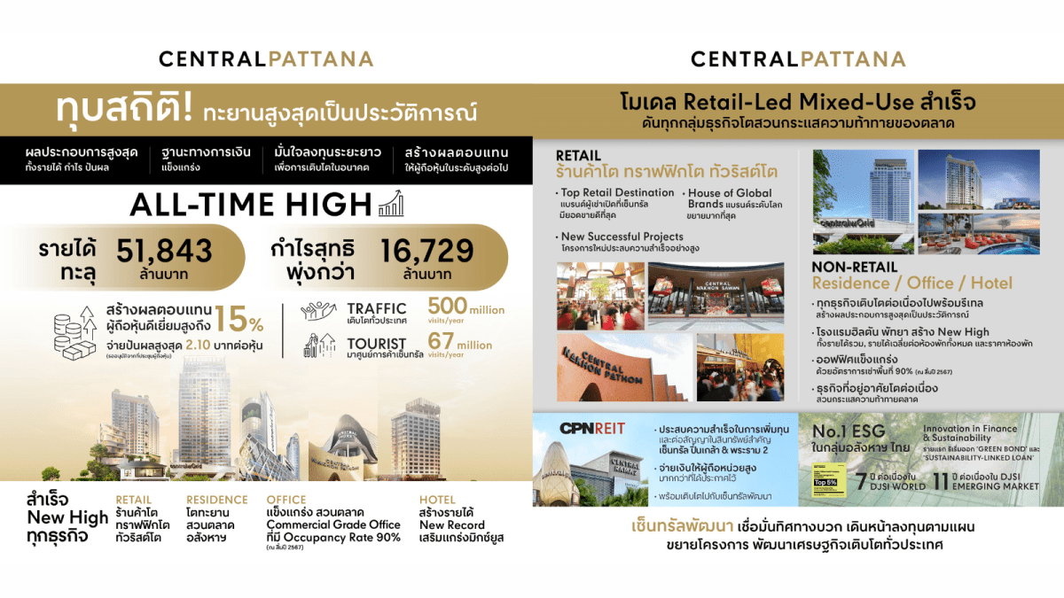 นางสาวนภารัตน์ ศรีวรรณวิทย์ Chief Finance, Accounting and Risk Management Officer บมจ. เซ็นทรัลพัฒนา กล่าวว่า “ผลประกอบการใน ปี 2567 ของบริษัทฯ เติบโตดีเยี่ยมในทุกกลุ่มธุรกิจ ทั้งศูนย์การค้า โครงการที่อยู่อาศัย อาคารสำนักงาน และโรงแรมทั่วประเทศ โดยบริษัทฯ ได้รายงานงบการเงินปี 2567 ด้วยตัวเลขที่สูงสุดเป็นประวัติการณ์ มีรายได้รวมที่ 51,843 ล้านบาท และกำไรสุทธิ 16,729 ล้านบาท เติบโต 11% จากปีก่อนหน้า พร้อมสร้างผลตอบแทนผู้ถือหุ้นสูงถึง 15% รวมทั้งประกาศจ่ายปันผลสูงสุดเป็นประวัติการณ์ 2.1 บาทต่อหุ้น* โดยบริษัทฯ มีฐานะทางการเงินแข็งแกร่ง พร้อมเดินหน้าลงทุนสร้างการเติบโตและผลตอบแทนระดับสูงแก่ผู้ถือหุ้นต่อไป สะท้อนวิสัยทัศน์ระยะยาวของบริษัทในการดำเนินธุรกิจด้วยความยั่งยืน ลงทุนต่อเนื่อง มีความมั่นคงทางการเงิน ด้วยวินัยทางการเงินที่ดี และกลยุทธ์การดำเนินธุรกิจที่ดีที่ให้ผลตอบแทนแก่ทุก Stakeholders”(* ตัวเลขเพื่อนำเสนอและรอการอนุมัติจากผู้ถือหุ้น)