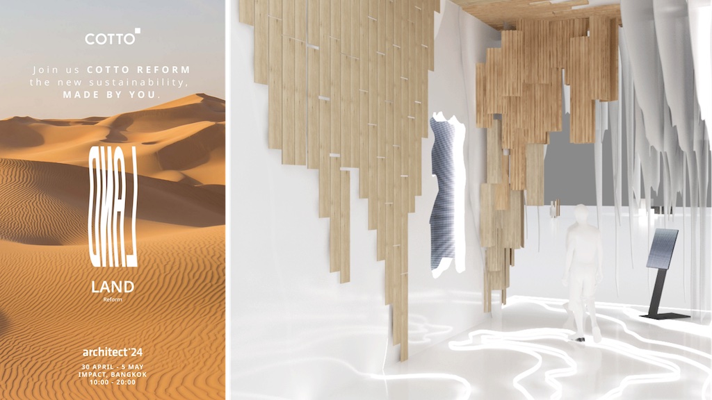 สำหรับ Booth Experience ของ COTTO ในปีนี้ มาในคอนเซปต์ ‘reform the new sustainability, made by you.’ โดยดึงคำว่า REFORM มาเป็นจุดตั้งต้นแนวคิด ด้วยมีความหมายแอบแฝงได้หลายนัยยะ ไม่ว่าจะเป็น การปรับความคิด การเปลี่ยนแปลงกฎเกณฑ์ ไปจนถึงที่เราต่างตั้งคำถาม ว่าวันนี้ การที่โลกใบนี้ REFORM ตัวเองอยู่ตลอดเวลาและเร็วกว่าที่คิด COTTO ในฐานะผู้ผลิต ผู้บริโภค เราเปลี่ยนแปลง ปรับตัว เพื่อช่วยโลกอย่างไรบ้าง?! ซึ่งที่ผ่านมา COTTO ได้พัฒนากระบวนการรักษ์โลก ไปสู่การเปิดมุมมองจากผู้ร่วมธุรกิจและผู้เชี่ยวชาญ เพื่อความเป็นอยู่และสุขภาวะที่ดีของของผู้คน และส่งผลกระทบต่อโลกน้อยที่สุด ทั้งนี้ จนกว่าจะไปสู่เป้าหมายใหญ่ที่เรากำลังจะเดินทางไป คือ NET ZERO Carbon Emission ภายในปี 2050 งาน “สถาปนิก’67” นับเป็นอีกหนึ่งก้าวเล็กๆ ให้ COTTO ได้โชว์ไอเดียสรรค์สร้างงานดีไซน์ให้เป็นที่ประจักษ์ ให้นักออกแบบได้ตระหนักถึงความสำคัญของการเลือกใช้วัสดุ ผลิตภัณฑ์ที่เป็นมิตรต่อโลก