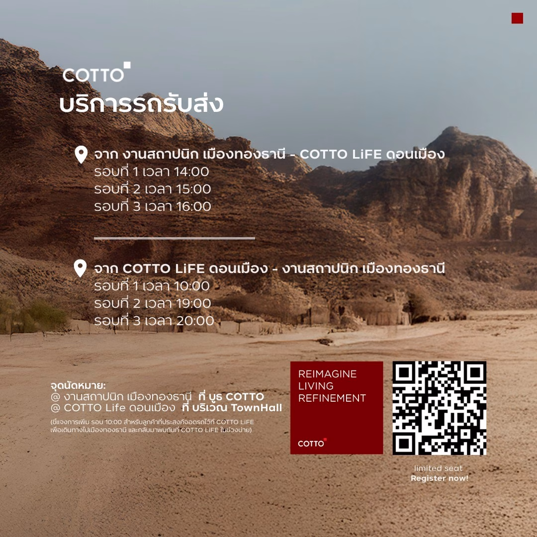 และรถตู้รับส่งจาก COTTO LiFE ดอนเมือง – งานสถาปนิก เมืองทอง : 10.00, 19.00, 20.00 น.