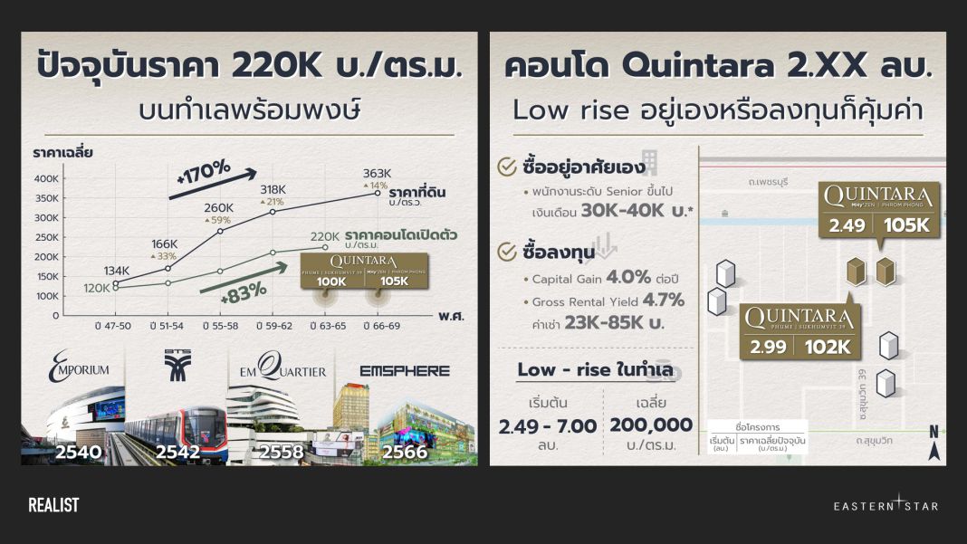 อีสเทอร์น สตาร์ฯ ระบุแผนพัฒนาโครงการทำเลสุขุมวิท ปัจจุบันเปิดขายคอนโดฯโลว์ไรส์ 2 โครงการ “ควินทารา ภูม สุขุมวิท 39” ,”ยอดขายพุ่ง 70% ส่วนควินทารา มาย‘เซน พร้อมพงษ์” ยอดขายแตะ 50% เผยย่านสุขุมวิท ราคาปล่อยเช่าราคาสูง ผลตอบแทนการลงทุน 4% ต่อปี พบกลุ่ม Gen Z หันเช่าบ้านมากกว่าซื้อ เชื่ออสังหาฯครึ่งปีหลังยังเผชิญความท้าทายจากหนี้ครัวเรือน วอนรัฐปรับเกณฑ์ LTV ใหม่ เอื้อกู้ซื้อบ้านและคอนโดฯหลังแรก