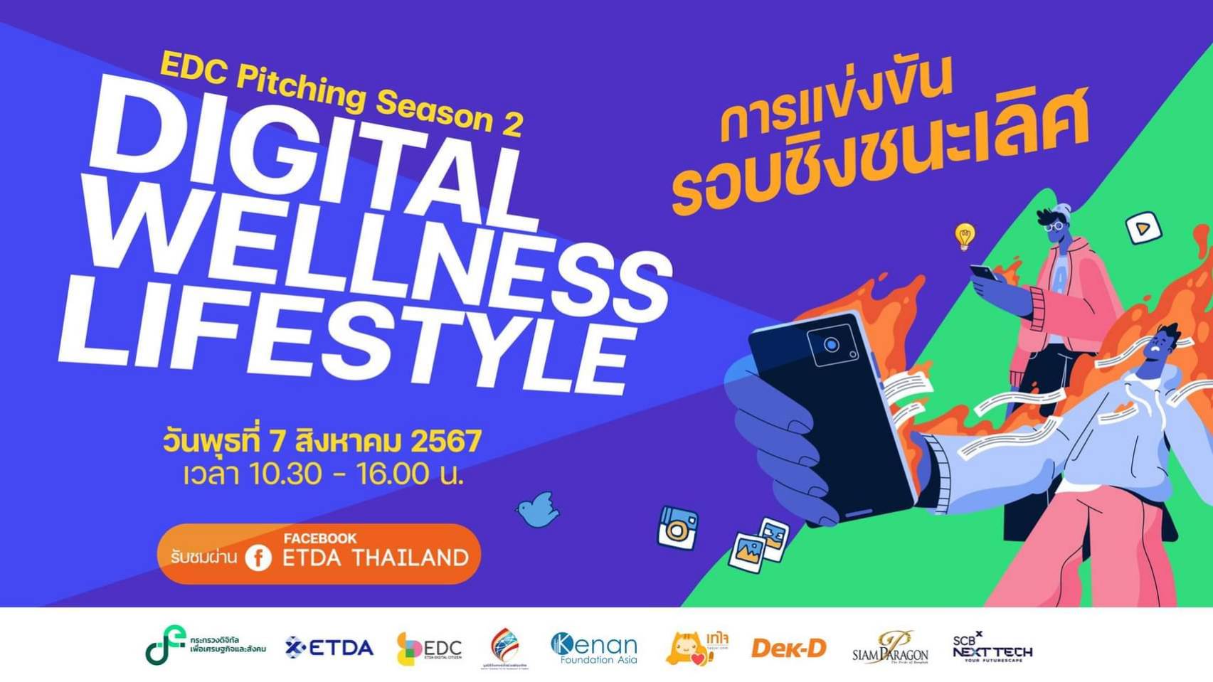 สำนักงานพัฒนาธุรกรรมทางอิเล็กทรอนิกส์ (ETDA) กระทรวงดิจิทัลเพื่อเศรษฐกิจและสังคม จับมือพาร์ทเนอร์ ได้แก่ มูลนิธิอินเทอร์เน็ตร่วมพัฒนาไทย, เทใจดอทคอม และมูลนิธิคีนันแห่งเอเซีย จัดการแข่งขัน EDC Pitching Season 2 รอบชิงชนะเลิศ ในหัวข้อ “Digital Wellness Lifestyle”เฟ้นหาสุดยอดแคมเปญที่รณรงค์การใช้งานออนไลน์อย่างพอดีและมีสติร่วมสร้างสุขภาพสังคมที่ดีชิงเงินรางวัลรวม150,000บาท ถ่ายทอดสดเพื่อร่วมลุ้นพร้อมกัน 7 สิงหาคมนี้ ที่เพจเฟซบุ๊ก ETDA Thailand