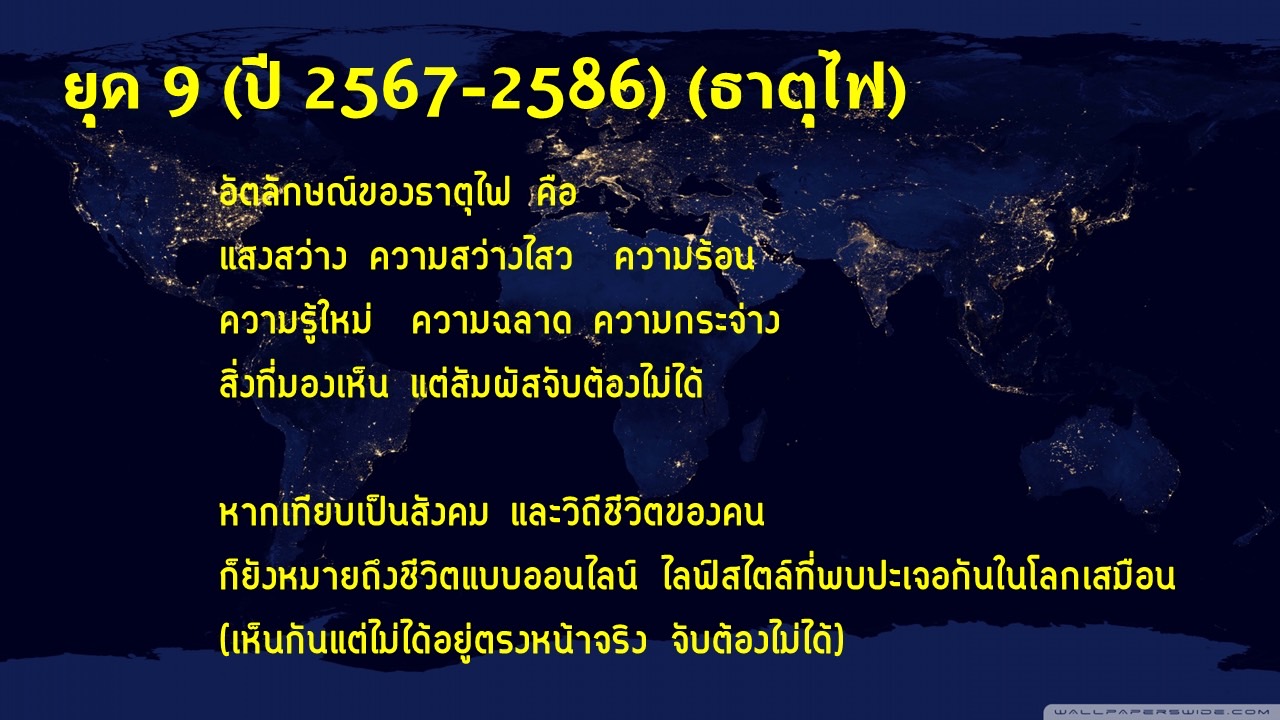 ทั้งนี้ สิ่งที่ควรระวังสำหรับยุค 9 คือ พลังงานด้านลบ ทั้งตัวแทนของสงคราม ภาวะทางอารมณ์ที่รุนแรง รวมทั้งดาวสงครามที่ส่งผลก่อให้เกิดความรุนแรงเป็นอย่างมากในบางปี ส่วนของประเทศไทยจะเกิดการพัฒนาทางด้านอ่าวไทย และภาคใต้ที่เศรษฐกิจขยายตัวอย่างมากเมื่อเทียบกับยุคที่ผ่านมา