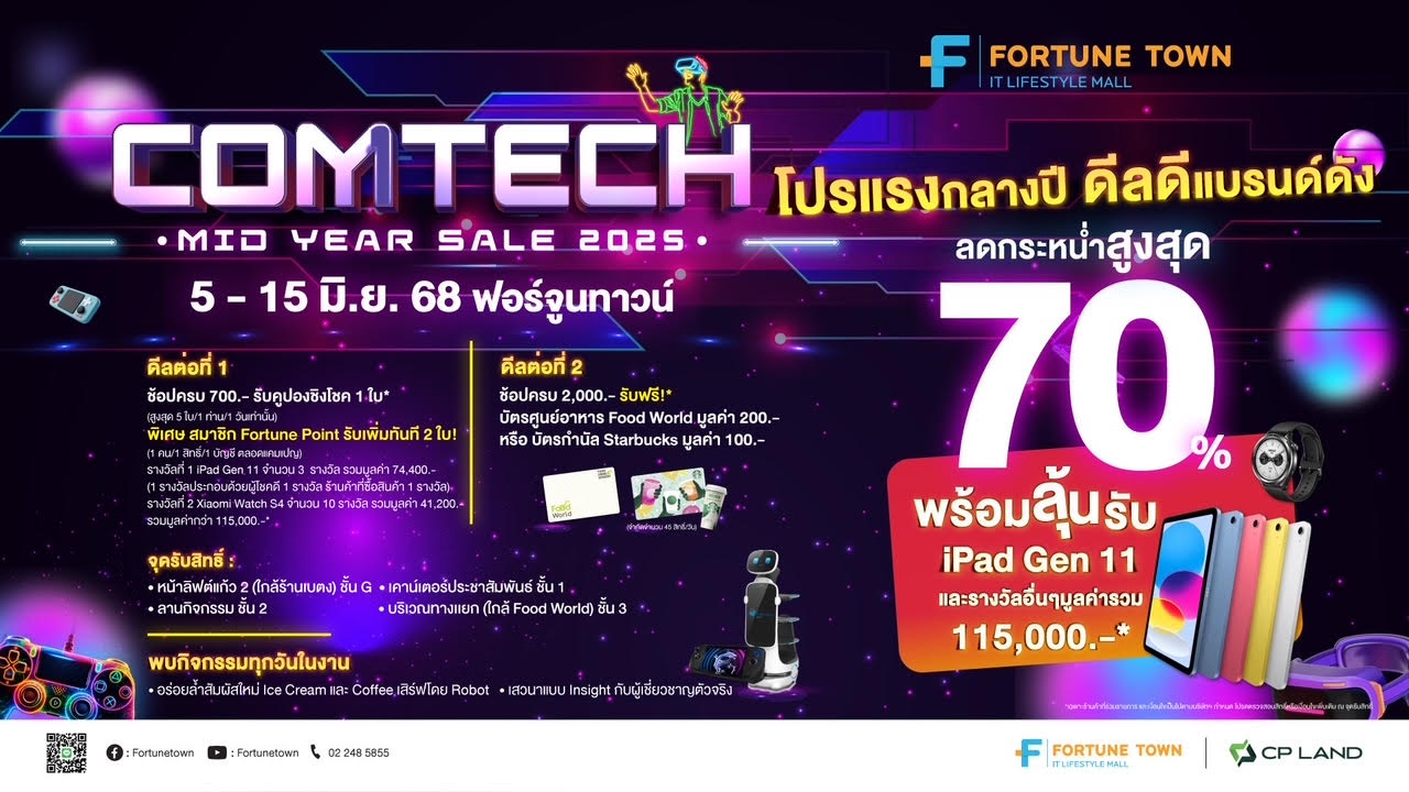 ฟอร์จูนทาวน์ (Fortune Town) ศูนย์รวมไอทีและไลฟ์สไตล์ชั้นนำย่าน รัชดา-พระราม 9 ภายใต้การบริหารงานของ บริษัท ซี.พี. แลนด์ จำกัด (มหาชน) หรือ CP LAND จับมือพันธมิตรและร้านค้าภายในศูนย์ จัดแคมเปญใหญ่ “Comtech Mid Year Sale 2025” ขนทัพสินค้าและอุปกรณ์ไอทีจากแบรนด์ดัง ลดสูงสุดถึง 70% พร้อมลุ้นรับ iPad Gen 11 และของรางวัลอื่น ๆ รวมมูลค่ากว่า 115,000 บาท ระหว่างวันที่ 5 – 15 มิถุนายน 2568 ณ ฟอร์จูนทาวน์ รัชดา-พระราม 9