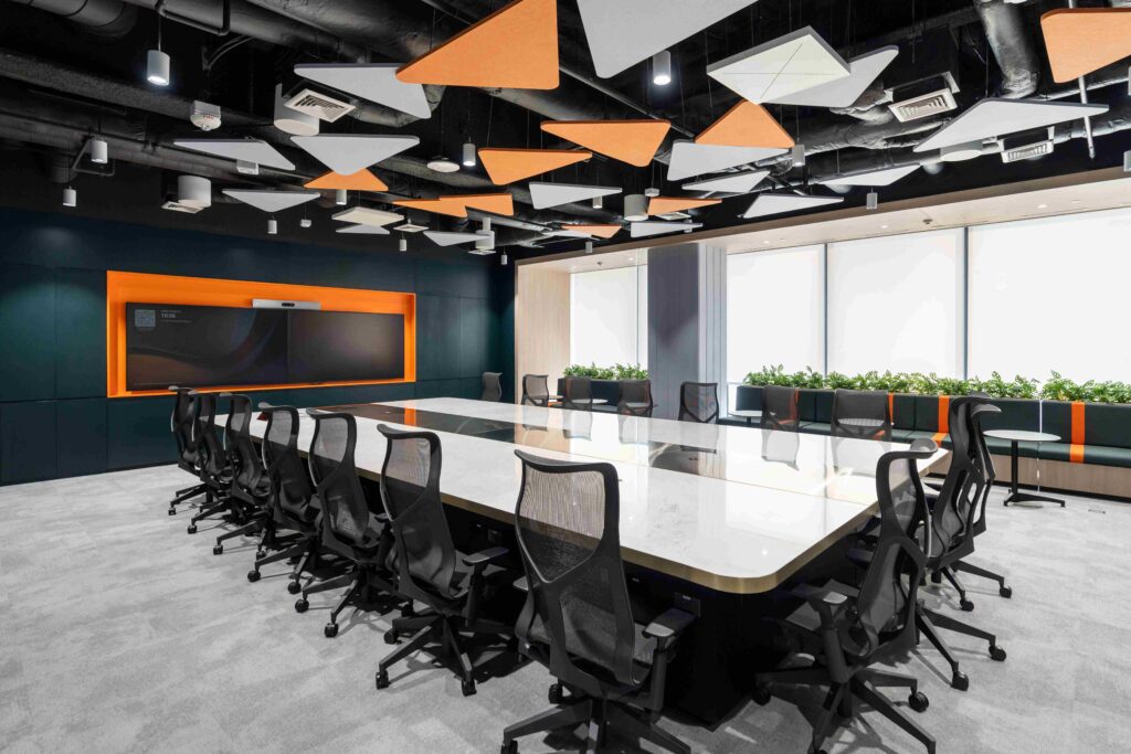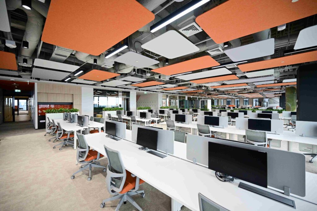 ในขณะที่การออกแบบภายในออฟฟิศคำนึงถึงสิ่งแวดล้อมและประสิทธิภาพการทำงาน โดยเลือกใช้กระจกบานกว้างเพื่อให้แสงธรรมชาติเข้ามา ลดการใช้ไฟฟ้า และติดตั้งผนังดูดซับเสียงเพื่อลดเสียงรบกวน สร้างบรรยากาศที่เหมาะสมต่อการทำงาน อุปกรณ์ทุกชิ้นในออฟฟิศจะเลือกผลิตภัณฑ์ที่เป็นวัสดุยั่งยืน มีข้อมูลด้านสิ่งแวดล้อม สนับสนุนการใช้ผลิตภัณฑ์และวัสดุที่ส่งผลกระทบต่อสิ่งแวดล้อมตั้งแต่เริ่มต้นกระบวนการผลิตน้อยที่สุด นอกจากนี้ ยังนำเทคโนโลยีล้ำสมัยมาใช้ เช่น ไมโครโฟน Gen AI ที่ปรับเสียงอัตโนมัติให้คมชัดทั้งการประชุมออนไลน์และออฟไลน์ พร้อมกล้องอัจฉริยะที่ติดตามผู้พูดได้อย่างแม่นยำ เพื่อยกระดับประสบการณ์การทำงานให้มีประสิทธิภาพสูงสุด