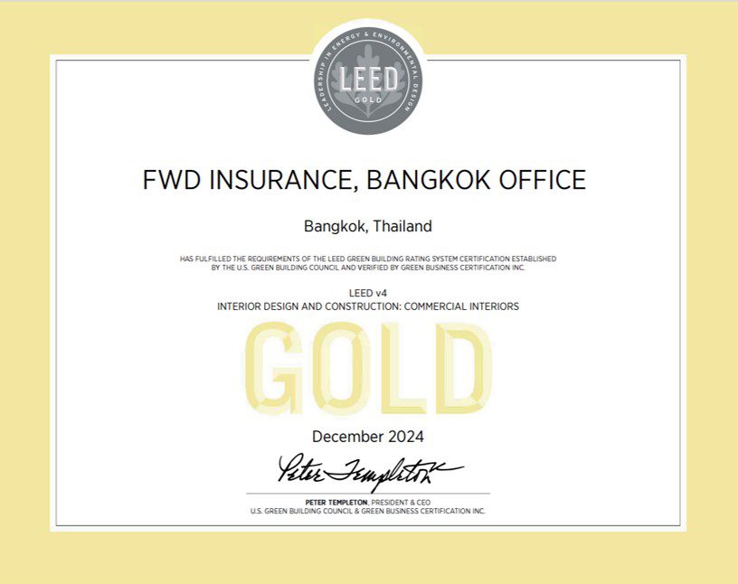 ออฟฟิศใหม่ของ FWD ประกันชีวิต ตั้งอยู่ในอาคารโอ-เนส ทาวเวอร์ ซึ่งเป็นออฟฟิศเกรด A ได้รับการรับรองมาตรฐาน LEED (Leadership in Energy & Environmental Design) ระดับ Gold & WELL ซึ่งเป็นมาตรฐานอาคารสีเขียวระดับสากล ในย่านนานา ทำเลใจกลางกรุงเทพฯ ที่สามารถเดินทางสะดวกด้วยรถไฟฟ้า BTS ลดการพึ่งพารถยนต์ ลดมลพิษทางอากาศ และช่วยให้พนักงานเดินทางได้สะดวกรวดเร็วขึ้น นอกจากนี้ตัวออฟฟิศใหม่แห่งนี้ยังได้รับมาตรฐาน LEED Gold Version 4 สำหรับการออกแบบภายในและก่อสร้าง (LEED for Interior Design and Construction: Commercial Interiors) ต้องผ่านเกณฑ์การตรวจสอบที่เข้มข้นในหลายด้าน เริ่มจากการเลือกสถานที่ การเจรจาเช่าซื้อ การตกแต่งภายใน และการจัดการสำนักงานอย่างต่อเนื่อง มุ่งเน้นการใช้ทรัพยากรอย่างมีประสิทธิภาพในทุกมิติ
