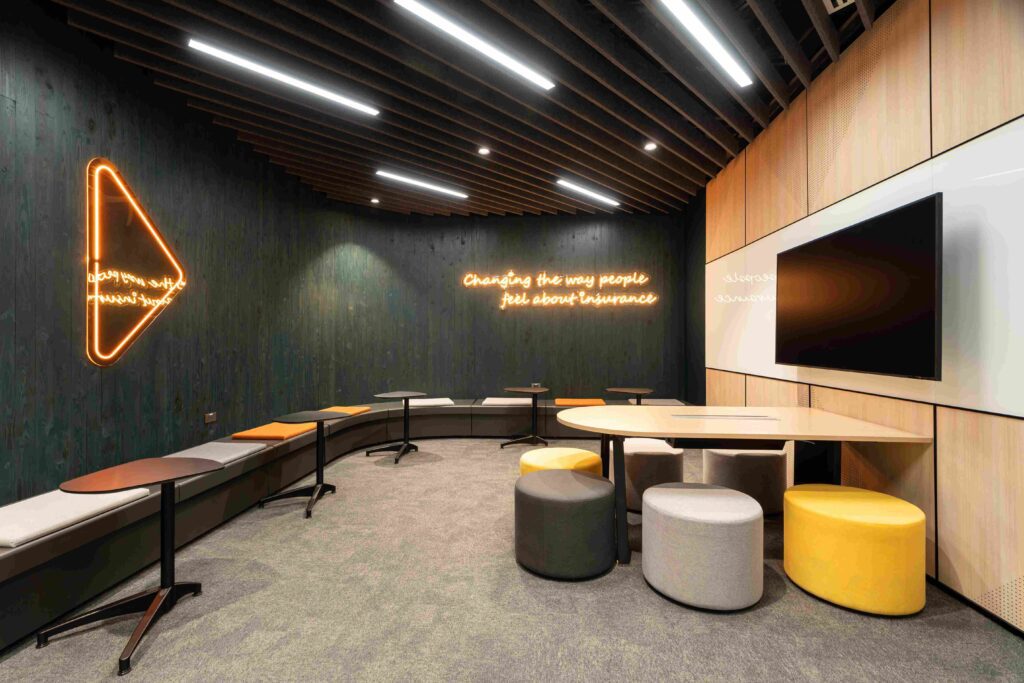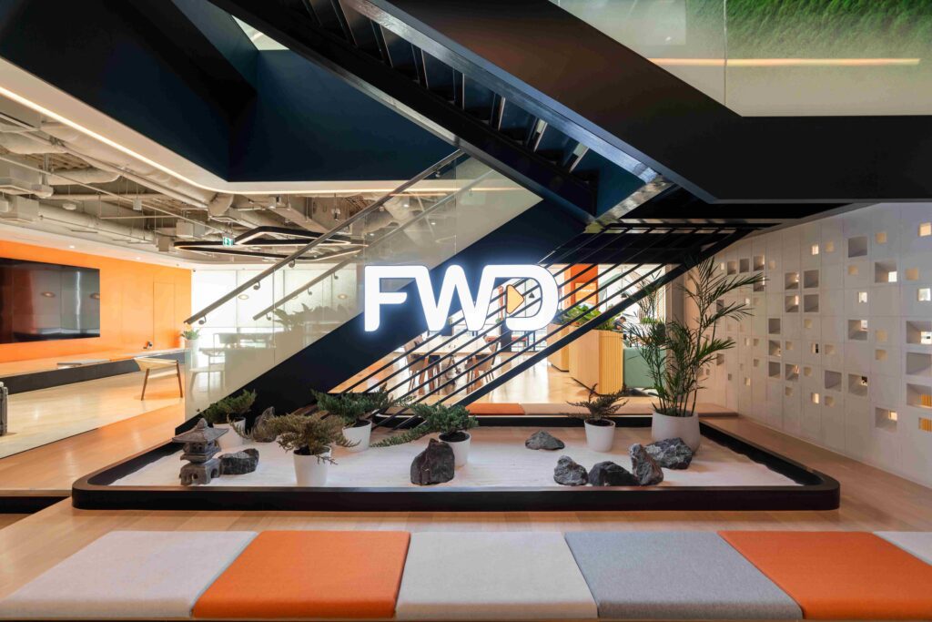 สำหรับออฟฟิศใหม่ของ FWD ประกันชีวิต ตั้งอยู่บนพื้นที่ขนาด 4,000 ตารางเมตร ถูกออกแบบให้โล่งไร้เสา พร้อมบันไดภายในออฟฟิศที่เชื่อมโยงระหว่างชั้น 22 และ 23 ทำให้เกิดความต่อเนื่องในพื้นที่ อีกทั้งยังประหยัดพลังงานจากการใช้ลิฟต์ โต๊ะและเก้าอี้ที่ใช้ได้รับการออกแบบตามหลักสรีรศาสตร์ (Ergonomic) เพื่อสุขภาพที่ดีของพนักงาน ที่สำคัญ เพื่อประสิทธิภาพในการประชุม ห้องประชุมทุกห้องผ่านการออกแบบ การใช้วัสดุเก็บเสียง และป้องกันเสียงออกไปจากห้องประชุมตามมาตรฐานสากล นอกจากนี้ พื้นที่ Workstation กว่า 400 จุด ถูกออกแบบให้รองรับการทำงานที่หลากหลาย ทั้งห้องคุยโทรศัพท์ที่ออกแบบมาเพื่อความเป็นส่วนตัว ห้องประชุมที่ออกแบบมาเป็นพิเศษให้เหมาะสมกับการสร้างสรรค์ไอเดียใหม่ๆ ที่หลากหลาย อีกทั้งยังมีห้องที่ถูกออกแบบเพื่อตอบโจทย์ความต้องการเฉพาะของพนักงาน เช่น ห้องละหมาด และห้องที่จัดเตรียมไว้สำหรับคุณแม่ที่ต้องการความเป็นส่วนตัวในการปั๊มนม เป็นต้น