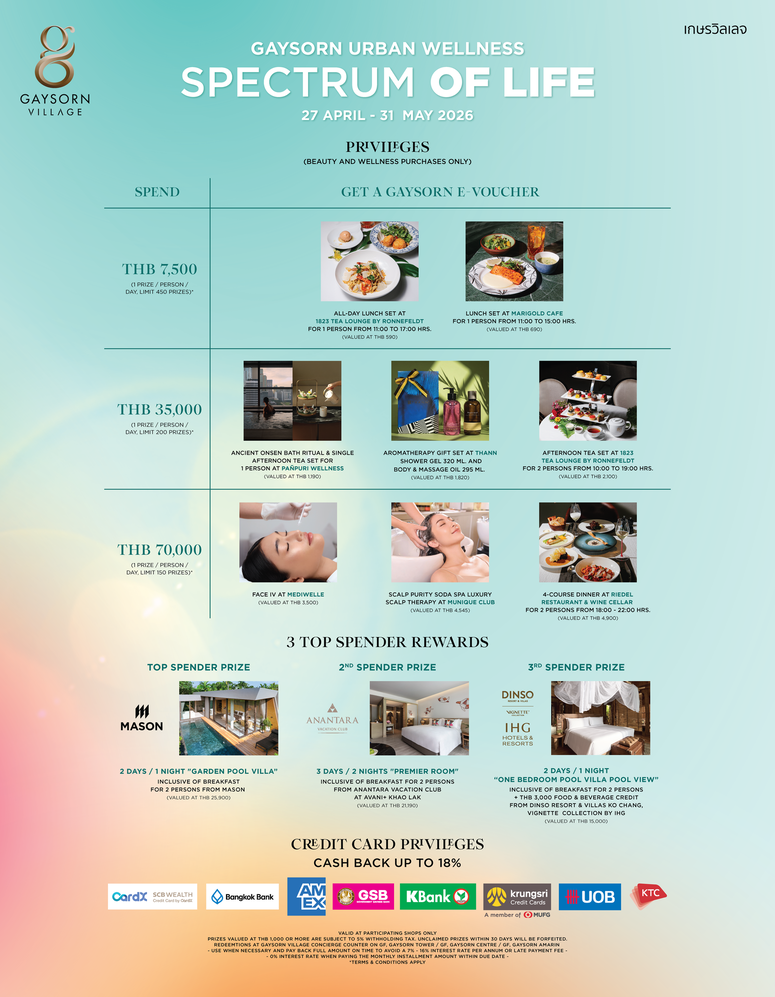 ทั้งนี้ ประสบการณ์ทั้งหมดถูกเชื่อมโยงเข้ากับแนวคิด “Gaysorn Urban Wellness” อาณาจักรสุขภาวะคนเมืองที่คัดสรรสินค้าและบริการชั้นนำด้านการดูแลสุขภาพและความงาม 47 แบรนด์ ครอบคลุมพื้นที่ทั้ง 3 อาคารของเกษรวิลเลจ ได้แก่ เกษรเซ็นเตอร์ (Gaysorn Centre), เกษรทาวเวอร์ (Gaysorn Tower) และเกษรอัมรินทร์ (Gaysorn Amarin) โดยครอบคลุมนวัตกรรมและการปรนนิบัติทั้งภายในและภายนอก ผ่านการดูแลสุขภาวะองค์รวม 4 มิติ ได้แก่ Health & Wellness, Mental Well-being, Beauty & Aesthetics และ Skincare & Cosmetic ซึ่งล้วนเป็นส่วนสำคัญในการยกระดับการใช้ชีวิตในแบบ “Spectrum of LIFE” ให้สมบูรณ์ยิ่งขึ้น